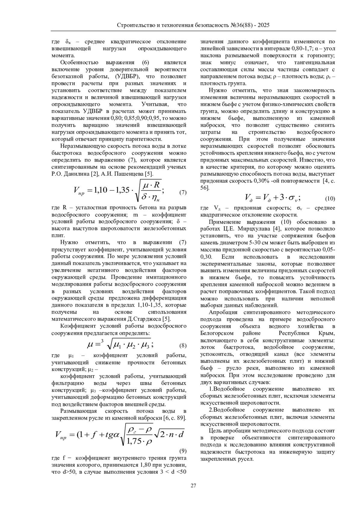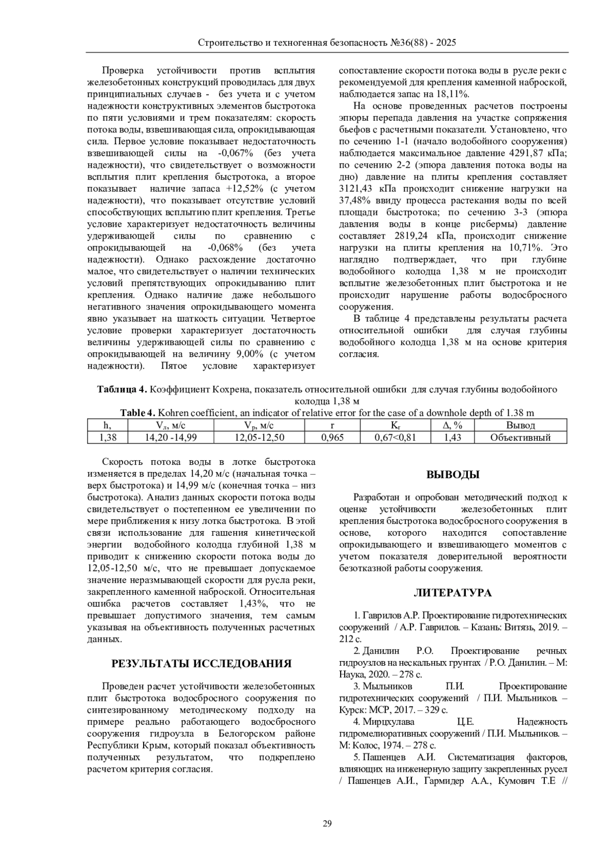 Материалы и методы: исследование выполнено на основе применения методов: анализа, позволившего провести совершенствование методического подхода к оценке устойчивости конструкций крепления водосбросного сооружения; вероятностного, позволившего провести апробацию предложенного подхода с учетом доверительного уровня надежности сооружения; корреляционного, позволившего установить степень тесноты между скоростями потока воды в конце быстротока и закрепленного русла реки; сравнительного, позволившего сопоставить параметры расчета устойчивости конструктивных элементов быстротока с учетом и без учета надежности.