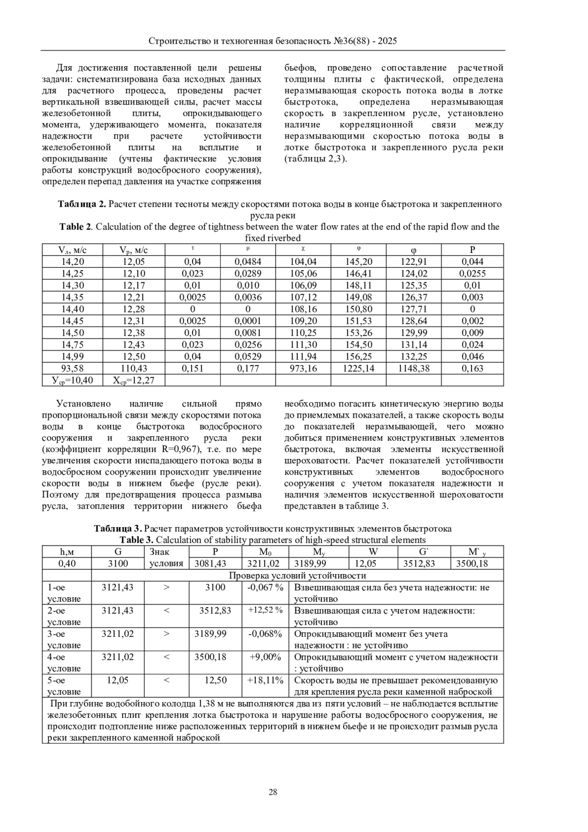 Представлен и опробован синтезированный методический подход к оценке устойчивости железобетонных плит крепления быстротока водосбросного сооружения на основе показателей надежности на всплытие и опрокидывание на примере реально работающего гидротехнического сооружения в Белогорском районе Республики Крым, который показал объективность полученных результатов, что подкреплено расчетом критерия согласия Кохрена. Доказано соответствующим расчетом наличие сильной прямо пропорциональной связи между скоростями потока воды в конце быстротока и закрепленного русла реки.