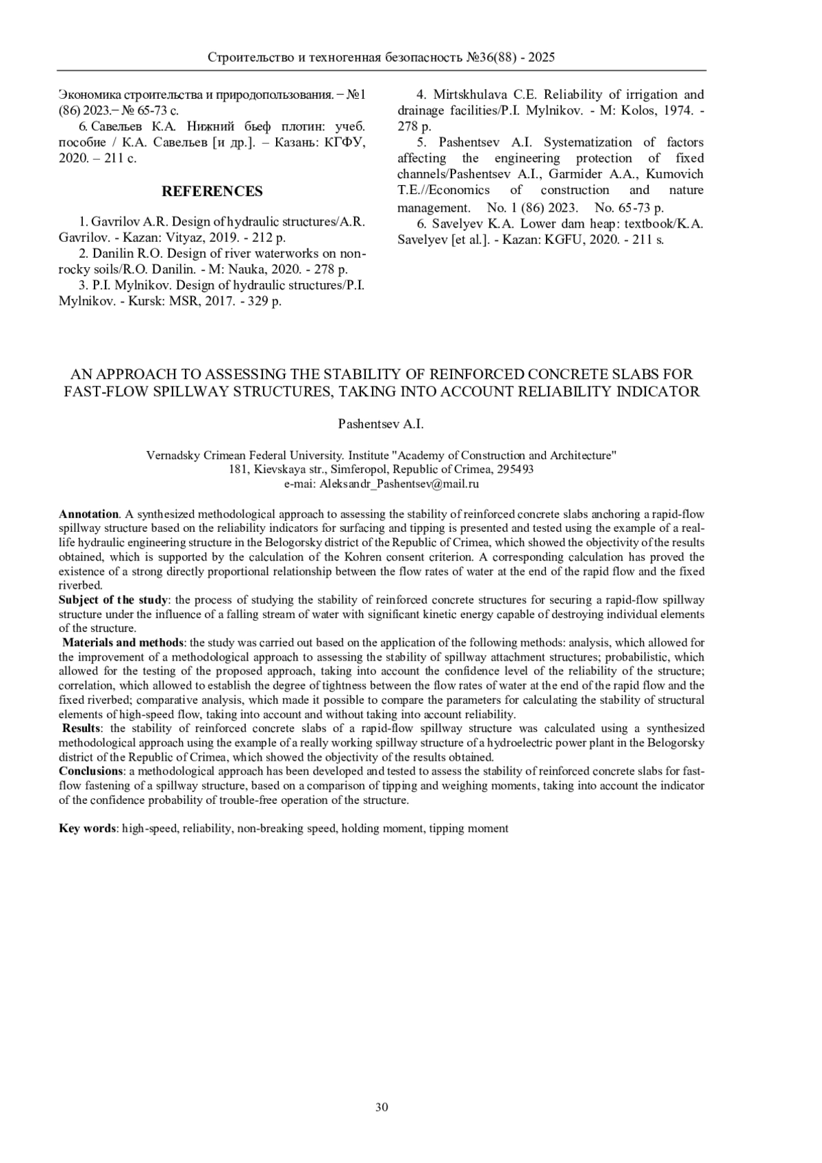 5. Пашенцев А.И. Систематизация факторов, влияющих на инженерную защиту закрепленных русел / Пашенцев А.И., Гармидер А.А., Кумович Т.Е // Экономика строительства и природопользования. ̶ №1 (86) 2023. ̶ № 65-73 с. EDN: DWAQXH