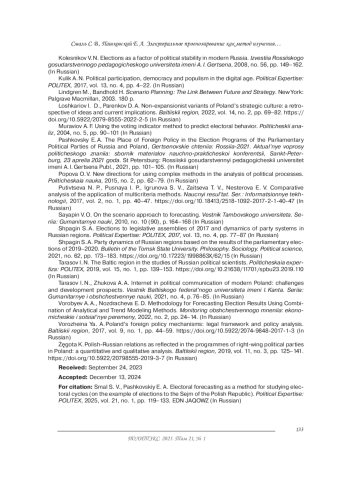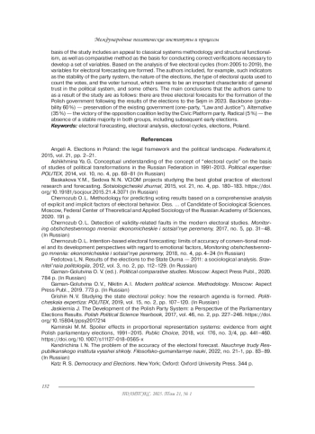43. Kandrichina I. N. The problem of the accuracy of the electoral forecast. Nauchnye trudy Respublikanskogo instituta vysshei shkoly. Filosofsko-gumanitarnye nauki, 2022. No. 21-1. P. 83-89. (In Russian).