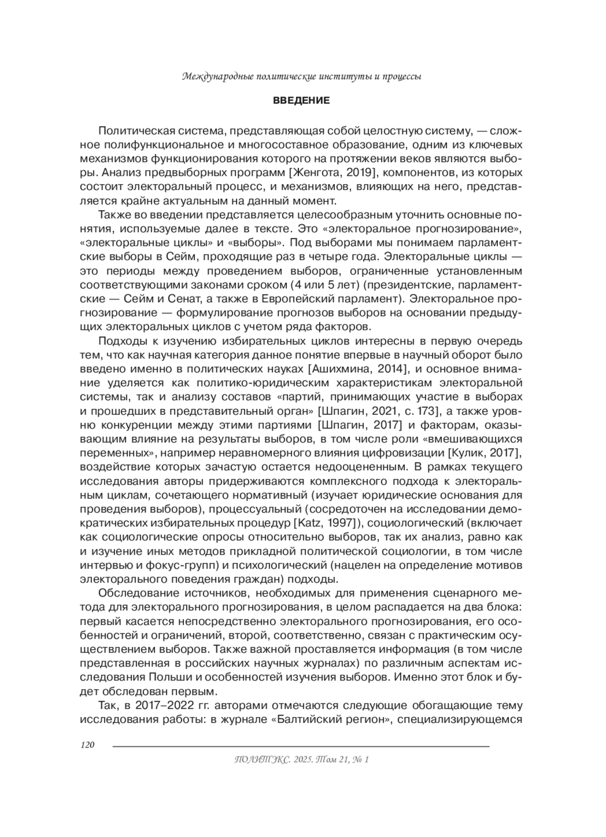 Актуальность исследования связана с возможностью политической науки делать компетентные прогнозы электоральных процессов как в России, так и за рубежом на основании данных предыдущих электоральных циклов. Электоральное прогнозирование представляется в целом значительно недооцененной отраслью политического анализа, в то время как обращение к нему позволит применить полученные знания к текущим политическим процессам, в том числе в Российской Федерации. Целью статьи является обоснование значимых переменных для осуществления валидного электорального прогнозирования, что реализовано на материале анализа пяти избирательных циклов Сейма Республики Польша и уточнено в ряде задач: дать описание общих терминов и подходов к изучению избирательных циклов, предложить и аргументировать переменные для построения электоральных моделей, применить электоральные прогнозные модели к выборам в Сейм Польши. Объектом исследования заявляются пять электоральных циклов формирования Сейма Польской Республики как специфическая область анализа, предметом выступают модели формирования большинства в Сейме применительно к итогам выборам в Сейм Республики Польша 2023 г. Методологическая основа исследования включает обращение к классической системной методологии и структурному функционализму, компаративизму, электоральному прогнозированию и статистическому анализу, а также кросс-темпоральному сравнению. На основании анализа пяти электоральных циклов (с 2005 по 2019 г.) формируются переменные для электорального прогнозирования, в которые авторы включили, например, такие показатели, как стабильность партийной системы, характер выборов, тип используемой для подсчета голосов избирательной квоты, а также некоторые другие. Основные выводы, к которым авторы пришли в результате проведенного исследования, таковы: существует три электоральных прогноза формирования правительства Польши по итогам выборов в Сейм 2023 г. Магистральный (вероятность 60 %) — сохранение существующего правительства (однопартийное, «Право и Справедливость»), альтернативный (35 %) — победа оппозиционной коалиции во главе с партией «Гражданская платформа», и радикальный (5 %) — отсутствие устойчивого большинства у обеих групп, включающее последующие скорые досрочные выборы