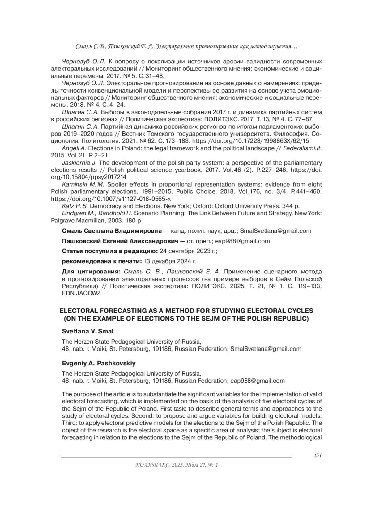 51. Pashkovsky E. A. The Place of Foreign Policy in the Election Programs of the Parliamentary Political Parties of Russia and Poland, Herzen Readings: Russia-2021. St. Petersburg: Herzen University, 2021, pp. 101-105/ (In Russian).