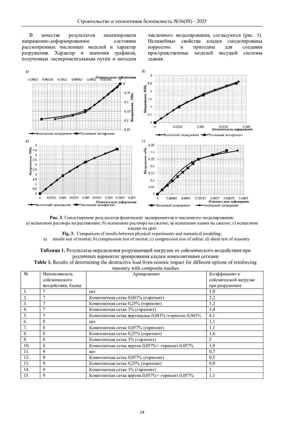Результаты: при помощи локальных моделей были определены нелинейные характеристики, позволяющие достоверно моделировать кладку из ячеистых бетонов. Далее при помощи пространственных моделей выполнена оценка влияния наличия, вида и степени армирования кладки из ячеистых бетонов композитными полимерными сетками.
