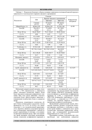 Цель работы - изучение изменчивости показателей белкового обмена в крови основных свиноматок полтавской мясной породы при оценке различных вариантов вводного скрещивания. Исследования были проведены на трёх группах основных свиноматок, различных по генотипу: I группа - чистопородные свиноматки полтавской мясной породы (n=17), II группа - свиноматки, полученные методом вводного скрещивания с использованием 12,5% доли крови финского ландраса (n=8), III группа - свиноматки, полученные методом вводного скрещивания с использованием 12,5% доли крови скороспелой мясной породы (n=8). Показатели белкового обмена у обследуемых свиноматок всех групп, за исключением коэффициента де Ритиса, находились в границах референтных интервалов. Наименьшие значения коэффициента вариации установлены у показателей общего белка, альбумина и глобулина (от 2,34% до 9,74%), наибольшие – у показателей активности АсАТ и АлАТ (от 37,75% до 56,82%). Использование различных вариантов вводного скрещивания у основных свиноматок полтавской мясной породы не приводило к достоверным изменениям в средних значениях показателей белкового обмена. Прилитие крови финского ландраса приводило к увеличению изменчивости показателей белкового обмена (за исключением коэффициента де Ритиса) от 0,44% до 18,63% в сравнении с чистопородными свиноматками. Прилитие крови скороспелой мясной породы приводило к снижению изменчивости показателей общего белка (на 1,71%), глобулина (на 6,83%), мочевины (на 10,96%), А/Г (на 3,33%), соотношения альбумин/мочевина (на 20,88%), соотношения глобулин/мочевина (на 11,43%), коэффициента де Ритиса (на 5,83%) соответственно. Использование породы финский ландрас для улучшения продуктивности приводит к более отличным сдвигам в метаболических потоках обмена белков и требует большего внимания к условиям разведения животных т. к. желаемое улучшение приводит к напряжению защитно-приспособительных и адаптивных качеств свиноматок. Повышение адаптивности свиноматок за счёт резервов скороспелой мясной породы приводит к менее значимым изменениям в белковом обмене и меньшему его напряжению, в сравнении с чистым генотипом.