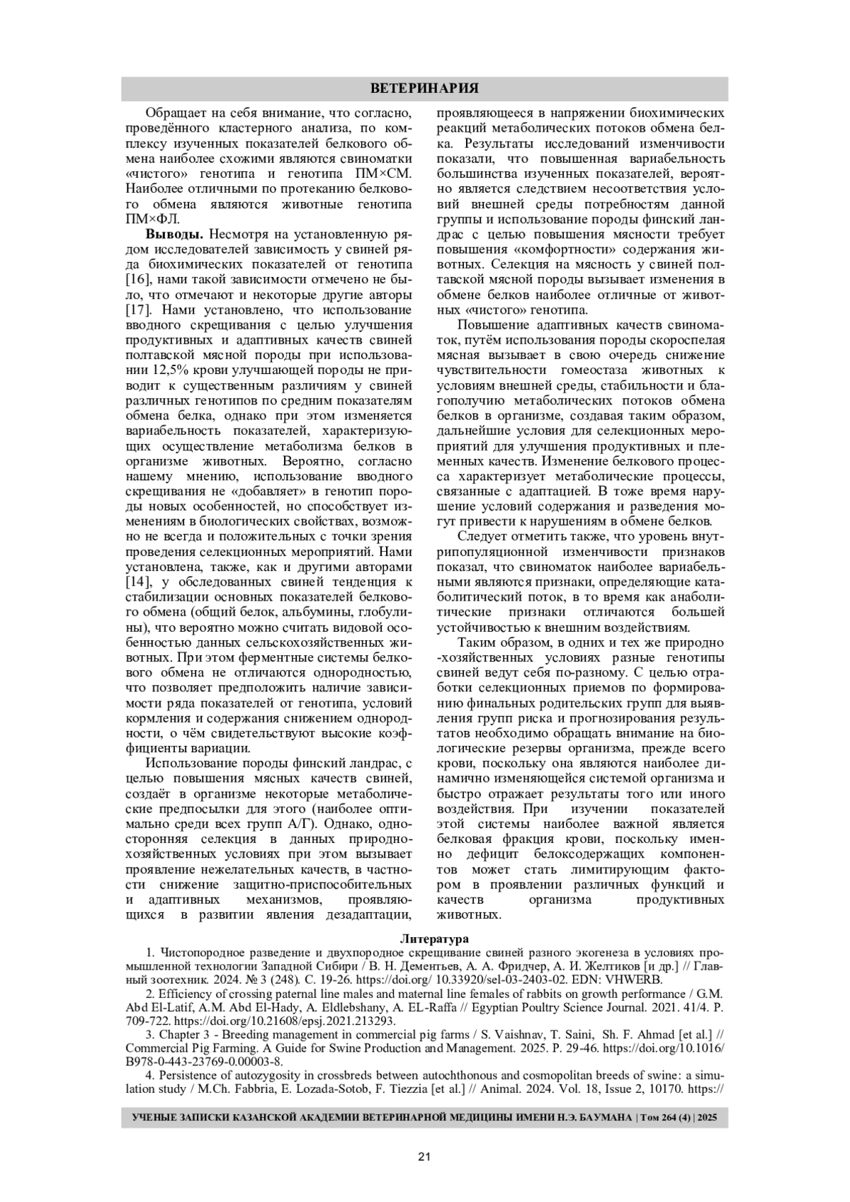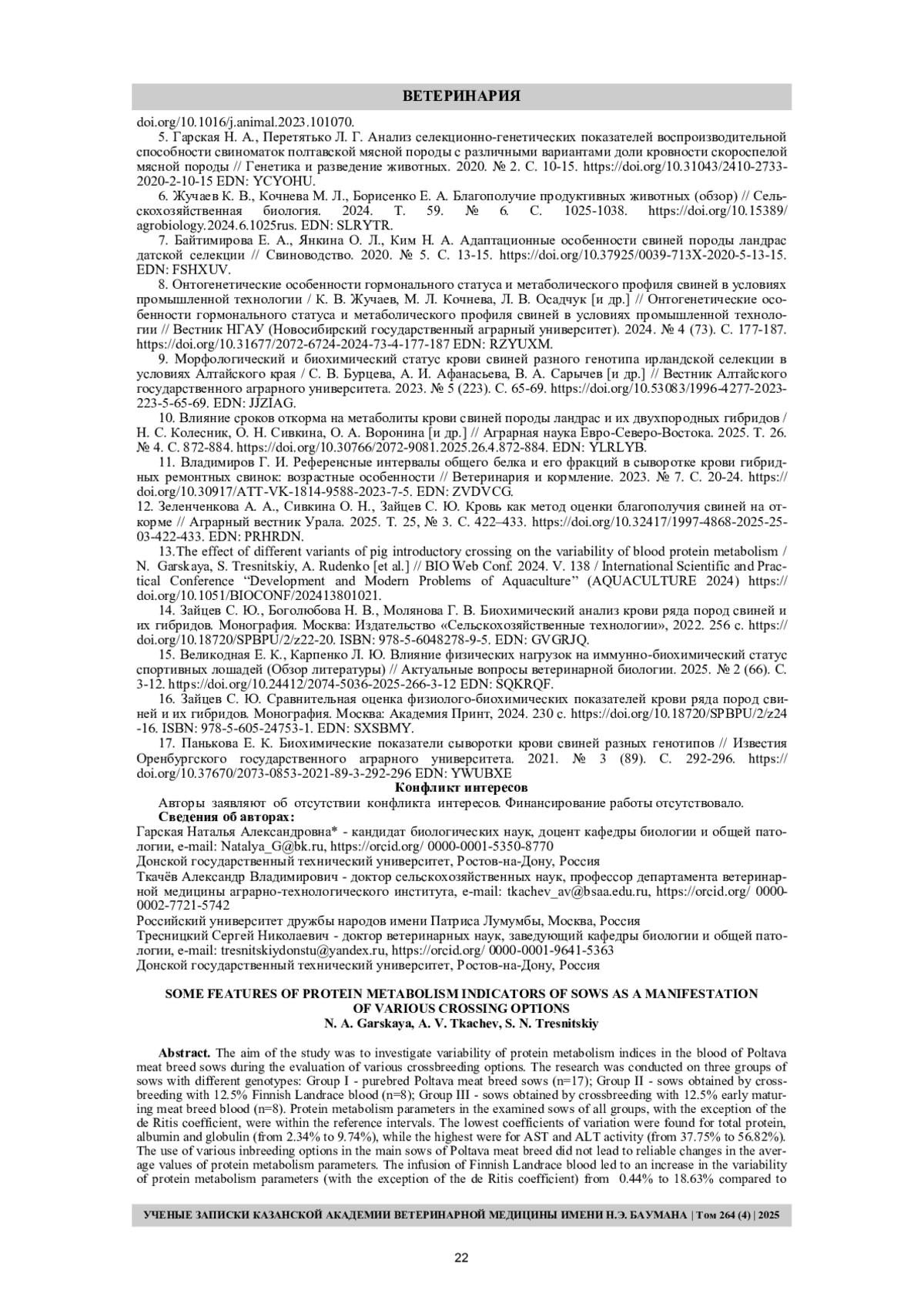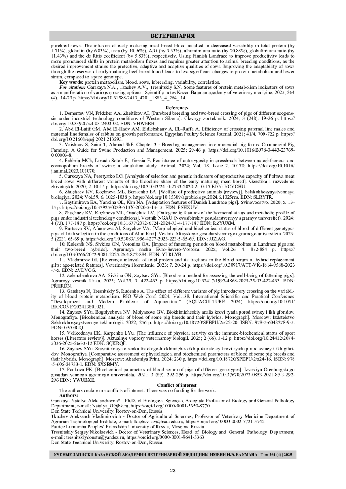 13. The effect of different variants of pig introductory crossing on the variability of blood protein metabolism / N. Garskaya, S. Tresnitskiy, A. Rudenko [et al.] // BIO Web Conf. 2024. V. 138 / International Scientific and Practical Conference “Development and Modern Problems of Aquaculture” (AQUACULTURE 2024). DOI: 10.1051/BIOCONF/202413801021