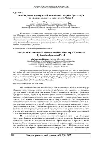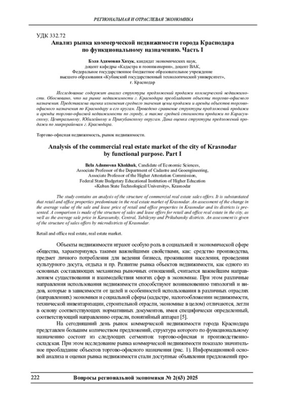 Исследование содержит анализ структуры предложений продажи коммерческой недвижимости. Обосновано, что на рынке недвижимости г. Краснодара преобладают объекты торгово-офисного назначения. Представлена оценка изменения среднего значения цены продажи и аренды объектов торгово-офисного назначения по Краснодару и его кругам. Проведено сравнение структуры предложений продажи и аренды торгово-офисной недвижимости по городу, а также средней стоимости продажи по Карасунскому, Центральному, Юбилейному и Прикубанскому округам. Дана оценка структуры предложений продажи по микрорайонам г. Краснодара.