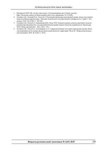 5. Осенняя А.В., Хахук Б.А., Бердникова В.Н., Хушт Н.И. Концептуальные аспекты оценочного моделирования при производстве государственной кадастровой оценки объектов недвижимости. Краснодар: ООО “Издательский Дом -Юг”, 2021. 174 с. EDN: XZUJLL