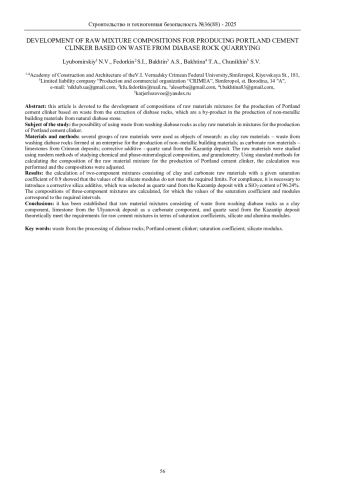 Материалы и методы: в качестве объектов исследования использованы несколько групп сырьевых материалов: в качестве глинистого сырья - отходы промывки диабазовых горных пород, образующиеся на предприятии по производству нерудных строительных материалов; в качестве карбонатного сырья - известняки Крымских месторождений; корректирующая добавка - кварцевый песок Казантипского месторождения. Сырьё исследовано с помощью современных методов исследования химического и фазово-минералогического состава, и гранулометрии. С помощью стандартных методик расчёта состава сырьевой смеси для получения портландцементного клинкера выполнен расчёт и проведена корректировка составов.