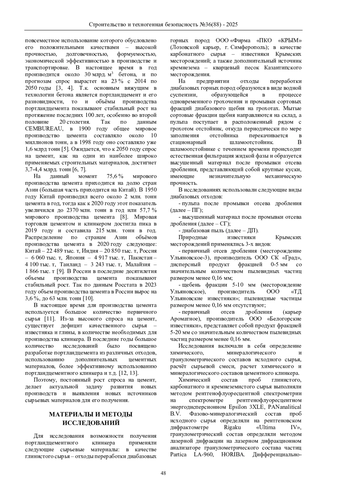 Настоящая статья посвящена разработке составов сырьевых смесей для получения портландцементного клинкера на основе отходов добычи диабазовых горных пород, являющихся побочным продуктом при производстве нерудных строительных материалов из природного диабазового камня.