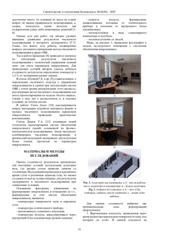 Статья является первой из серии по определению методологии применения численного моделирования при прогнозировании параметров микроклимата. В данной статье рассмотрены методы и материалы для проведения исследований и приведены результаты сравнения натурного эксперимента с результатами расчета, полученных численным моделированием с применением k-e модели турбулентного течения в условиях совокупного воздействия инженерных систем на формирование микроклимата.