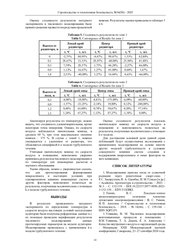 Выводы: выявлена значительная невязка результатов натурного эксперимента и численного модерирования по k-e модели турбулентного течения для скорости движения воздуха в условиях совокупного воздействия инженерных систем на формирование микроклимата.