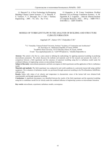 Материалы и методы: натурный эксперимент приводился в реальных условиях эксплуатации учебной аудитории вуза с помощью сертифицированного оборудования, оценка моделей турбулентности проводилась с помощью численного моделирования в программном комплексе FlowSimulation SolidWorks.