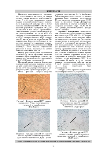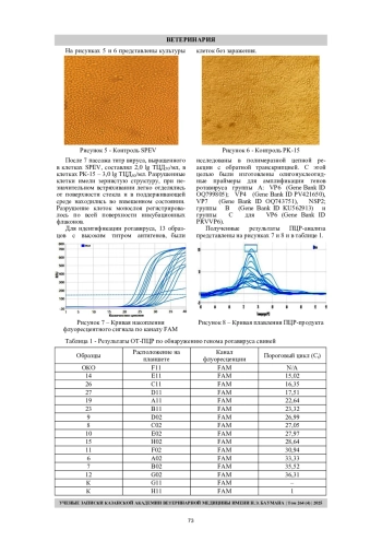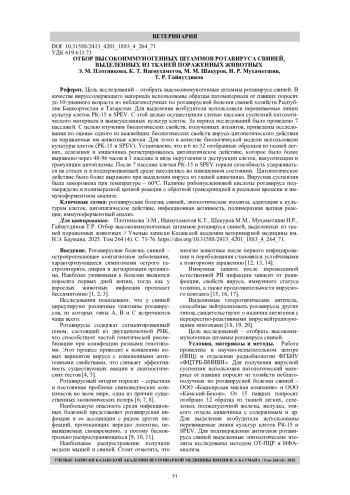 Цель исследований – отобрать высокоиммуногенные штаммы ротавируса свиней. В качестве вируссодержащего материала использованы образцы патоматериала от павших поросят до 10-дневного возраста из неблагополучных по ротавирусной болезни свиней хозяйств Республик Башкортостан и Татарстан. Для выделения возбудителя использовали перевиваемые линии культур клеток РК-15 и SPEV. С этой целью осуществляли слепые пассажи суспензий патологического материала и вышеуказанных культур клеток. За период исследований было проведено 7 пассажей. С целью изучения биологических свойств, полученных изолятов, приведены исследования по оценке одного из важнейших биологических свойств вируса-цитопатического действия на поражаемые им животные клетки. Для этого в качестве биологической модели использовали культуры клеток (PK-15 и SPEV). Установлено, что в 6 из 32 отобранных образцов из тканей легких, селезенки и кишечника регистрировалось цитопатическое действие, которое было более выражено через 48-96 часов в 3 пассаже в виде округления и деструкции клеток, вакуолизации и грануляции цитоплазмы. После 7 пассажа клетки РК-15 и SPEV теряли способность удерживаться на стекле и в поддерживающей среде находились во взвешенном состоянии. Цитопатическое действие было более выражено при выделении вируса из тканей кишечника. Вирусная суспензия была заморожена при температуре – 60℃. Наличие рибонуклеиновой кислоты ротавируса подтверждено в полимеразной цепной реакции с обратной транскрипцией в реальном времени и иммуноферментном анализе.