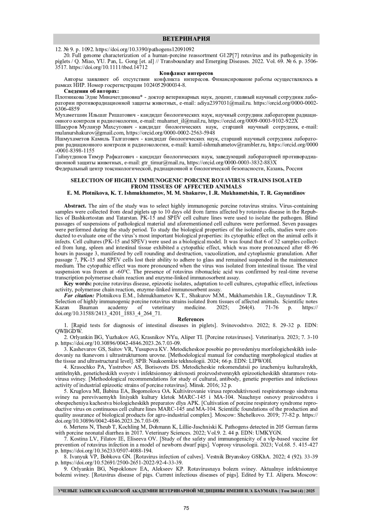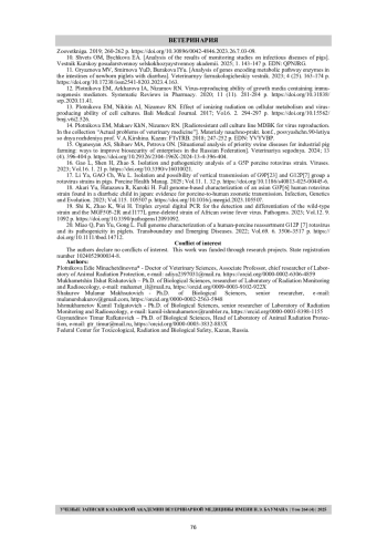 17. Isolation and possibility of vertical transmission of G9P[23] and G12P[7] group a rotavirus strains in pigs / YA. LI, CH. GAO, L. WU [et. al] // Porcine Health Manag. 2025. Vol. 11. № 1. р. 32. DOI: 10.1186/s40813-025-00445-6