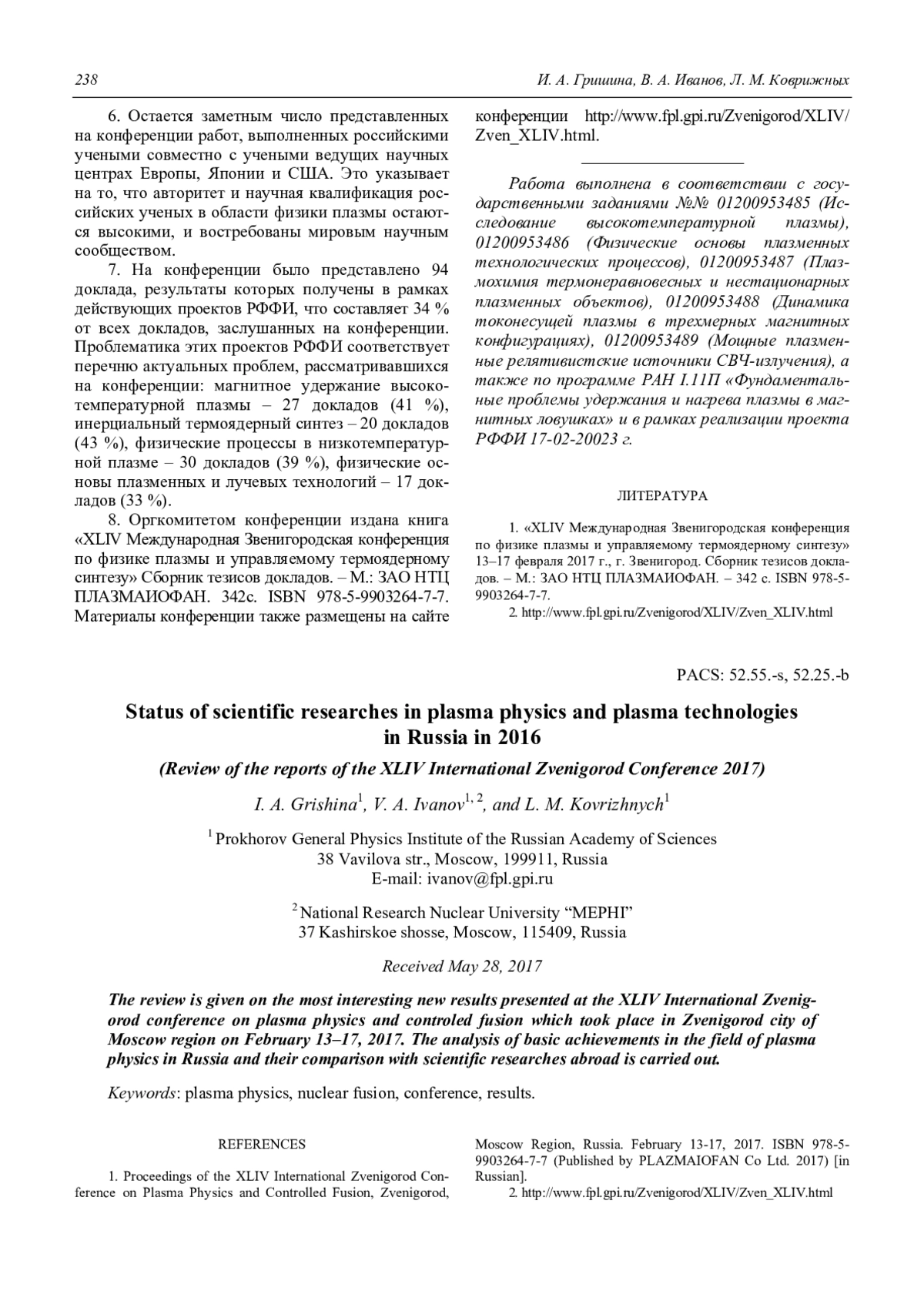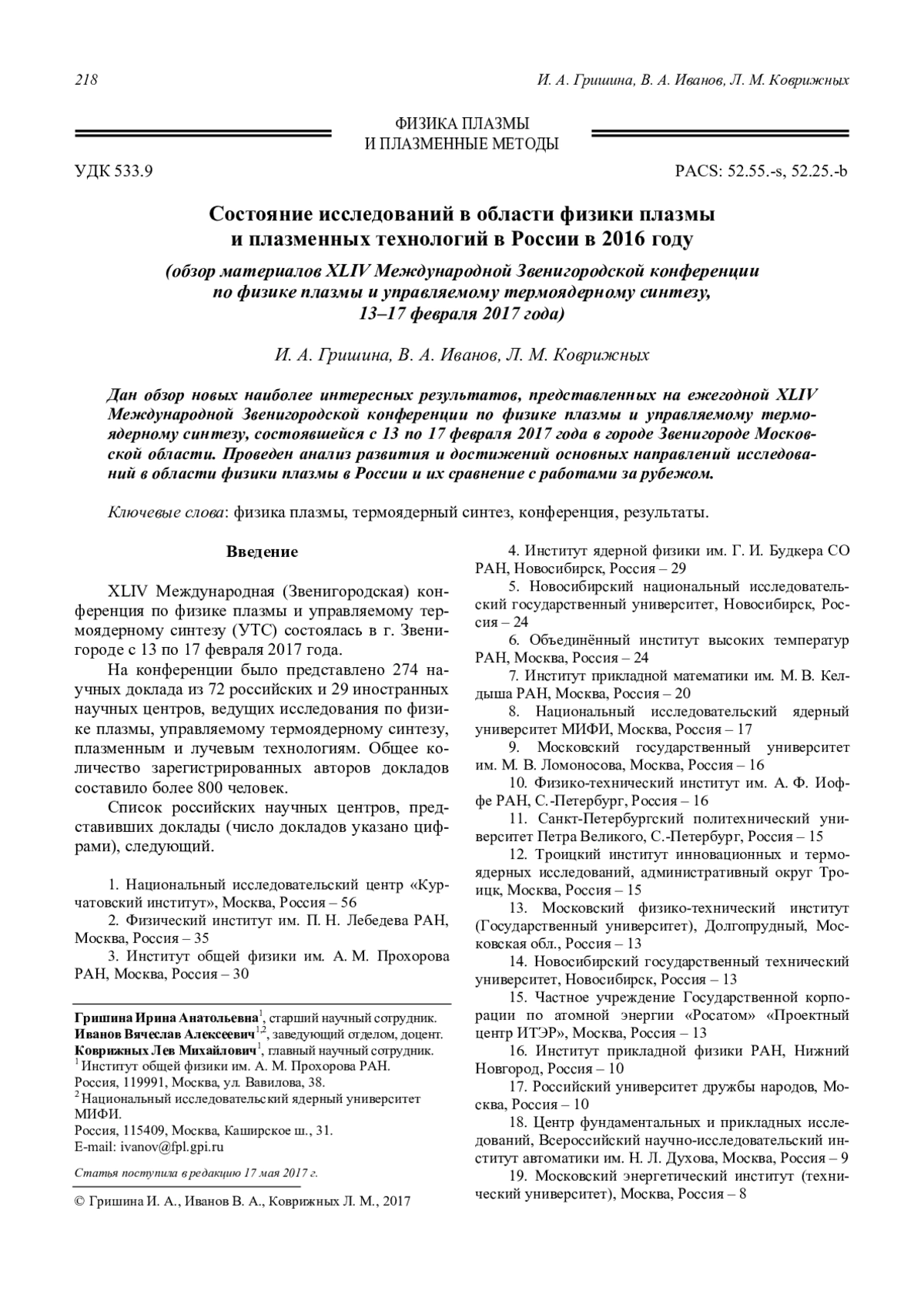I. A. Grishina, V. A. Ivanov, and L. M. Kovrizhnych Status of scientific researches in plasma physics and plasma technologies in Russia in 2016 (Review of the reports of the XLIV International Zvenigorod Conference) 218