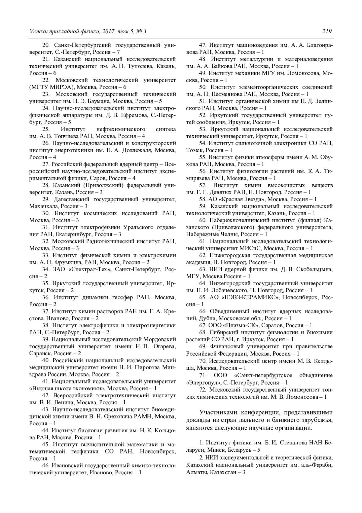 1. XLIV Международная (Звенигородская) конференция по физике плазмы и управляемому термоядерному синтезу является единственным ежегодным крупномасштабным научным форумом ученых, работающих в области физики плазмы и управляемого термоядерного синтеза в России и СНГ. Она проходила уже в 44-й раз и собрала на свои заседания более 800 участников из научных центров России и других стран. Число российских (72) и иностранных организаций (20), представивших доклады на конференцию, стабильно остается на высоком уровне.