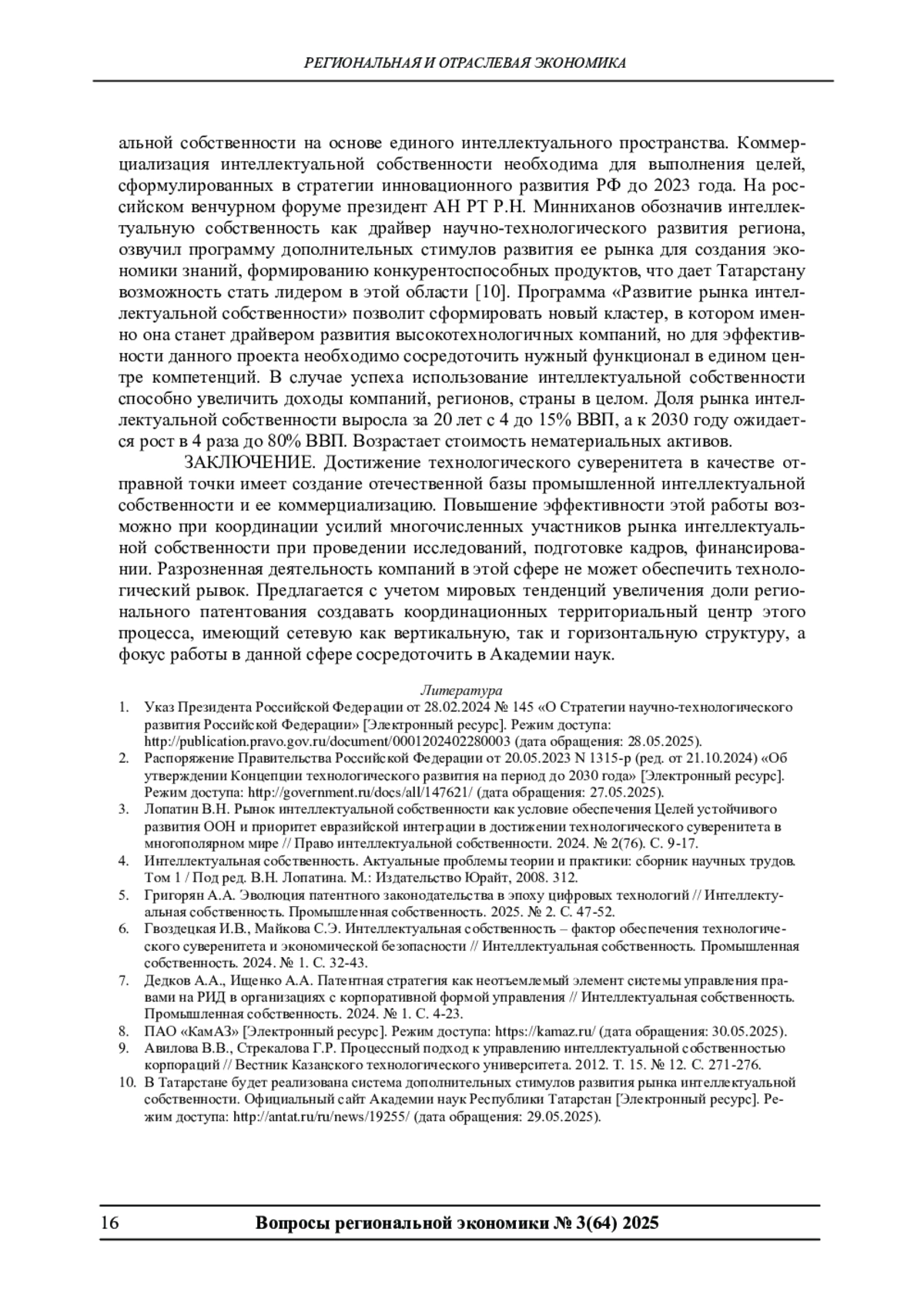 10. В Татарстане будет реализована система дополнительных стимулов развития рынка интеллектуальной собственности. Официальный сайт Академии наук Республики Татарстан [Электронный ресурс]. Режим доступа: http://antat.ru/ru/news/19255/(дата обращения: 29.05.2025).