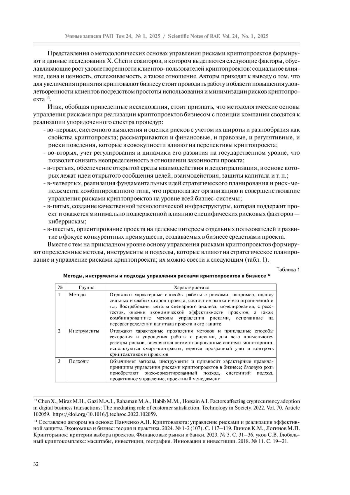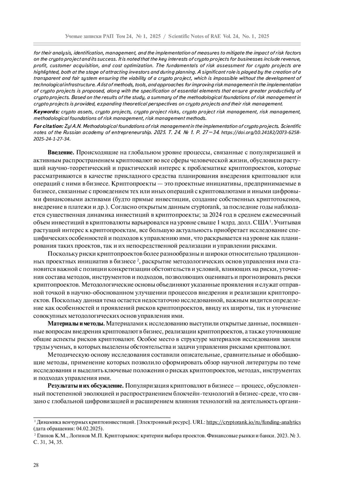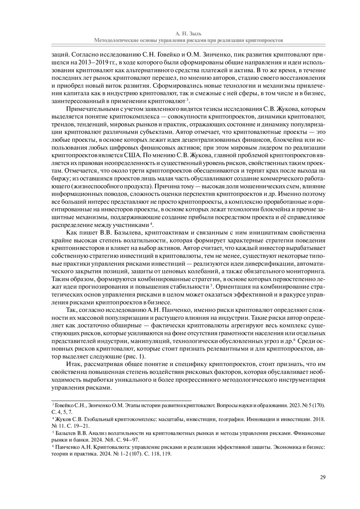 Статья посвящена уточнению концептуальных теоретико-методологических основ управления рисками при реализации криптопроектов в бизнесе. Определяются сущность и специфические особенности криптопроекта, которые в ракурсе управления рисками обуславливают существенную создаваемую криптопроектом рисковую нагрузку для всех интересантов. В соответствии с широтой рисков криптопроектов (и их динамизмом, сложностью), необходимость приобретает совершенствование процедур их анализа, идентификации, управления и реализации мероприятий по снижению воздействия рисковых факторов на криптопроект и его успешность. Отмечается, что ключевыми интересами криптопроектов для бизнеса являются доходы, прибыль, привлечение клиентов, оптимизация затрат. Выделяются основы оценки рисков криптопроектов как на стадии привлечения инвесторов, так и планирования. Существенную роль приобретает создание прозрачной и справедливой системы работоспособности криптопроекта, что невозможно без развития технологической инфраструктуры. Предлагаются перечни методов, инструментов и подходов для совершенствования управления рисками при реализации криптопроектов, а также уточняются обязательные элементы, обеспечивающие большую продуктивность криптопроектов. По итогам проведенного исследования приводится обобщение методологических основ управления рисками при реализации криптопроектов, которые расширяют теоретические представления о криптопроектах и их риск–менеджменте.