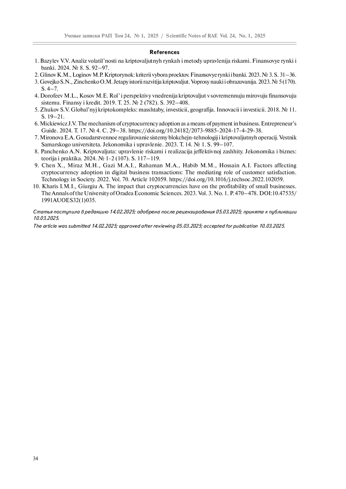 6. Мицкевич Е.В. Механизм внедрения криптовалют в качестве средства платежа в бизнесе. Путеводитель предпринимателя. 2024. Т. 17. № 4. С. 29-38. https://doi.org/10.24182/2073-9885-2024-17-4-29-38.
