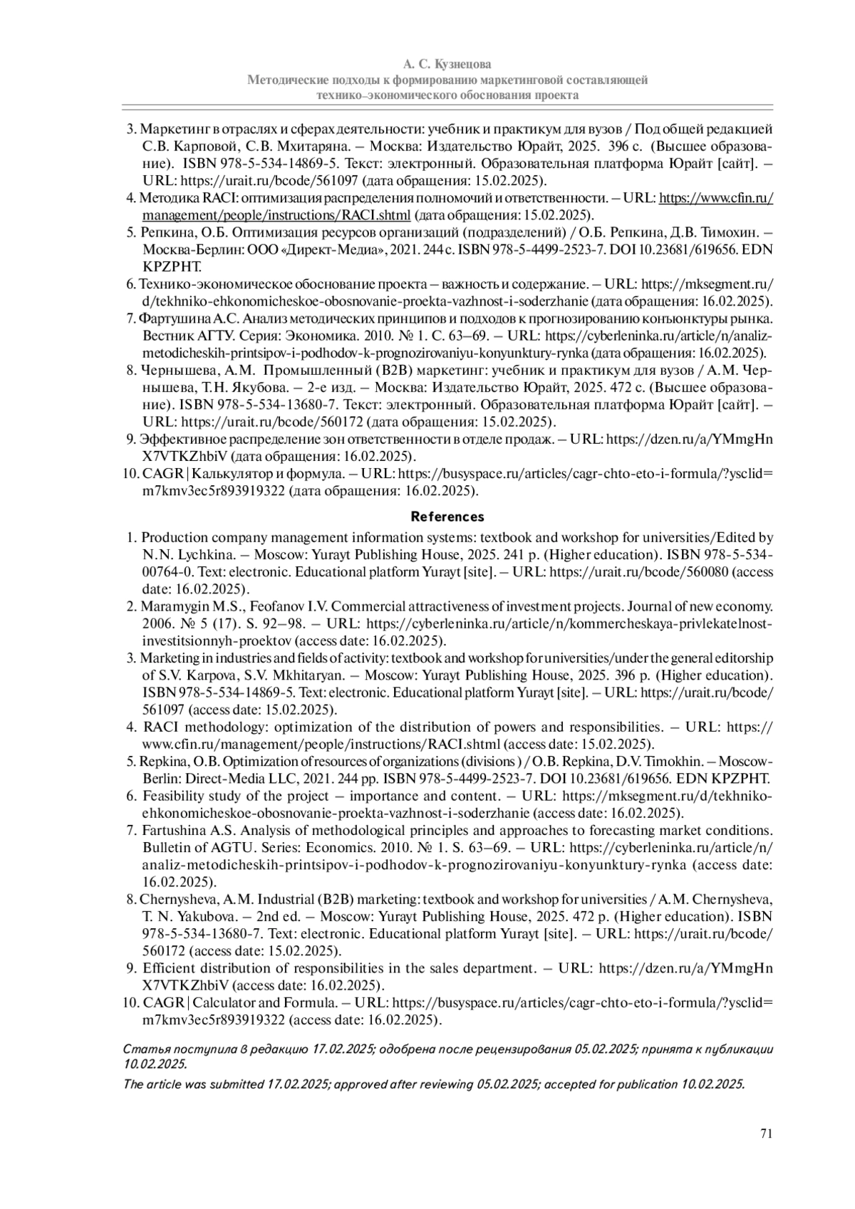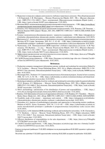 8. Чернышева, А.М. Промышленный (B2B) маркетинг: учебник и практикум для вузов / А.М. Чернышева, Т.Н. Якубова. - 2-е изд. - Москва: Издательство Юрайт, 2025. 472 с. (Высшее образование). ISBN 978-5-534-13680-7. Текст: электронный. Образовательная платформа Юрайт [сайт]. - URL: https://urait.ru/bcode/560172 (дата обращения: 15.02.2025).