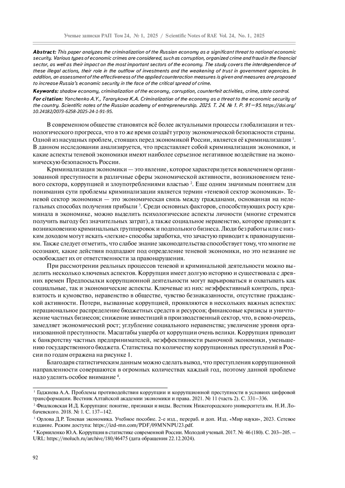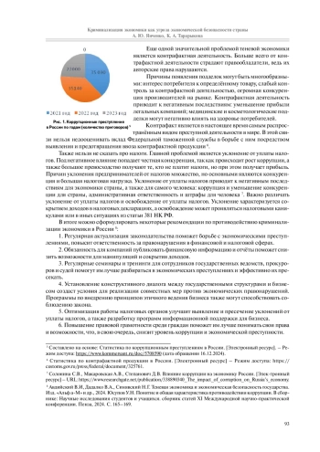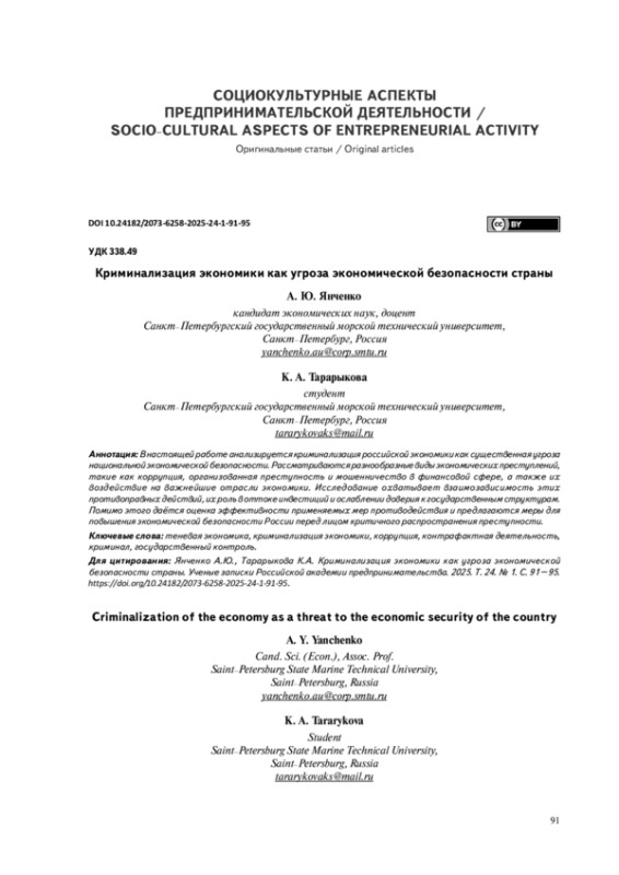 В настоящей работе анализируется криминализация российской экономики как существенная угроза национальной экономической безопасности. Рассматриваются разнообразные виды экономических преступлений, такие как коррупция, организованная преступность и мошенничество в финансовой сфере, а также их воздействие на важнейшие отрасли экономики. Исследование охватывает взаимозависимость этих противоправных действий, их роль в оттоке инвестиций и ослаблении доверия к государственным структурам. Помимо этого даётся оценка эффективности применяемых мер противодействия и предлагаются меры для повышения экономической безопасности России перед лицом критичного распространения преступности.