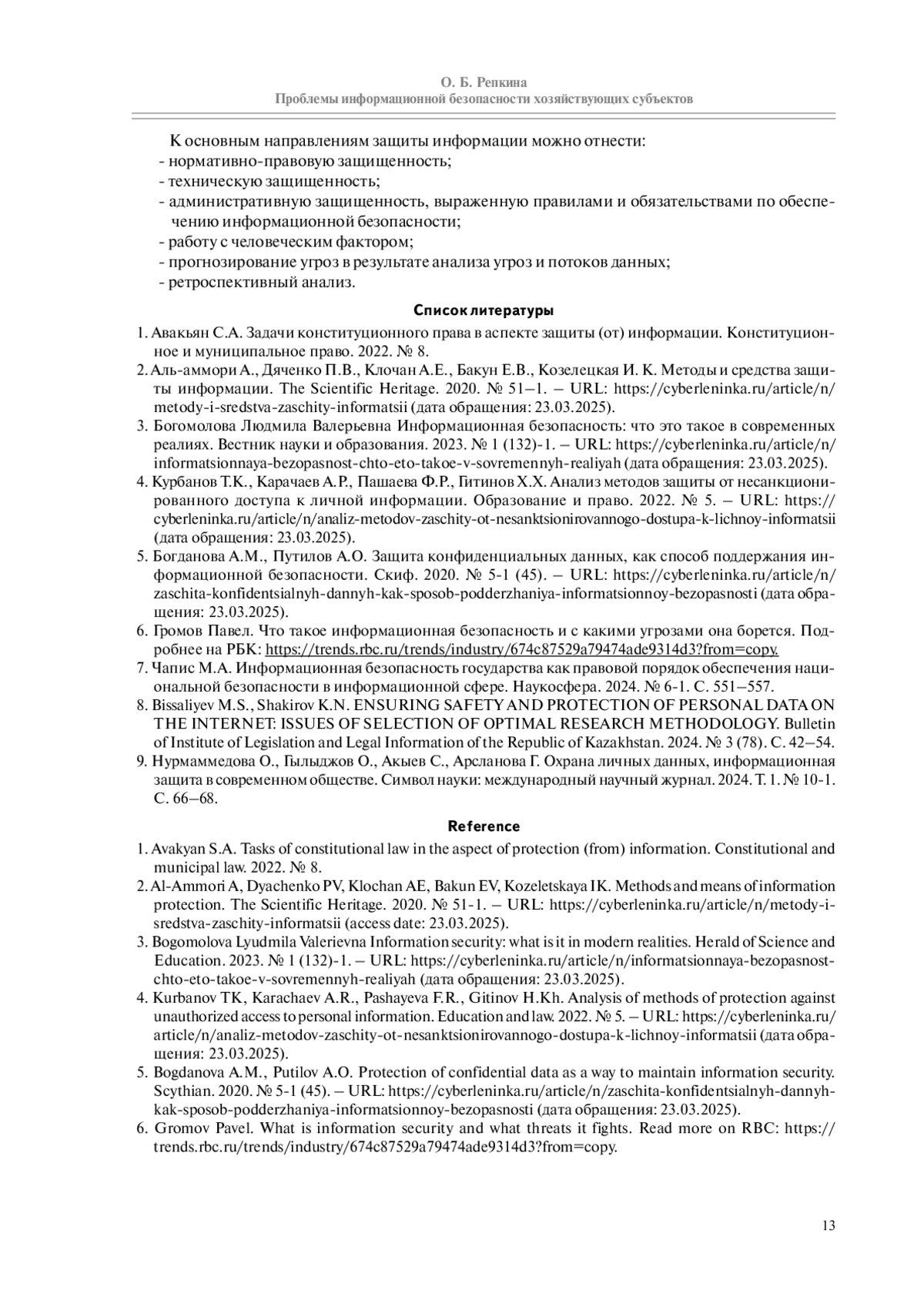9. Нурмаммедова О., Гылыджов О., Акыев С., Арсланова Г. Охрана личных данных, информационная защита в современном обществе. Символ науки: международный научный журнал. 2024. Т. 1. № 10-1. С. 66-68.