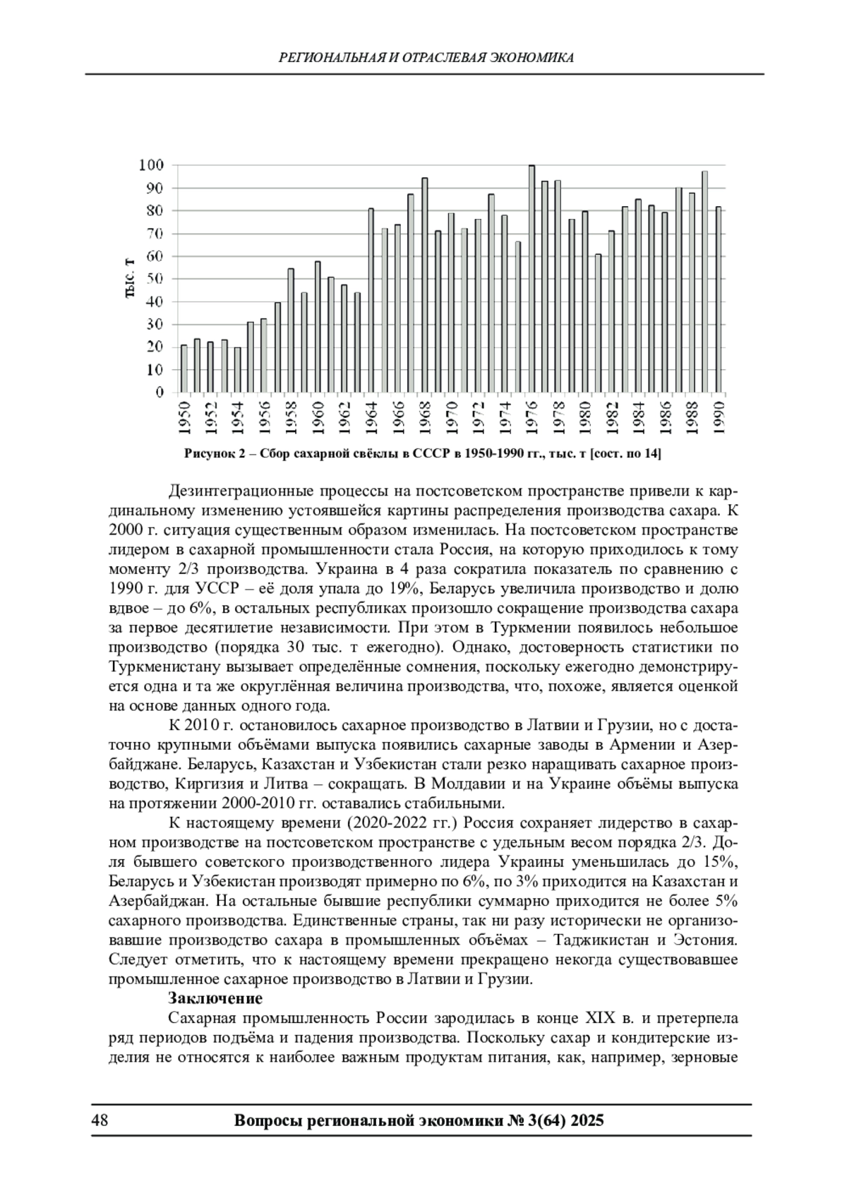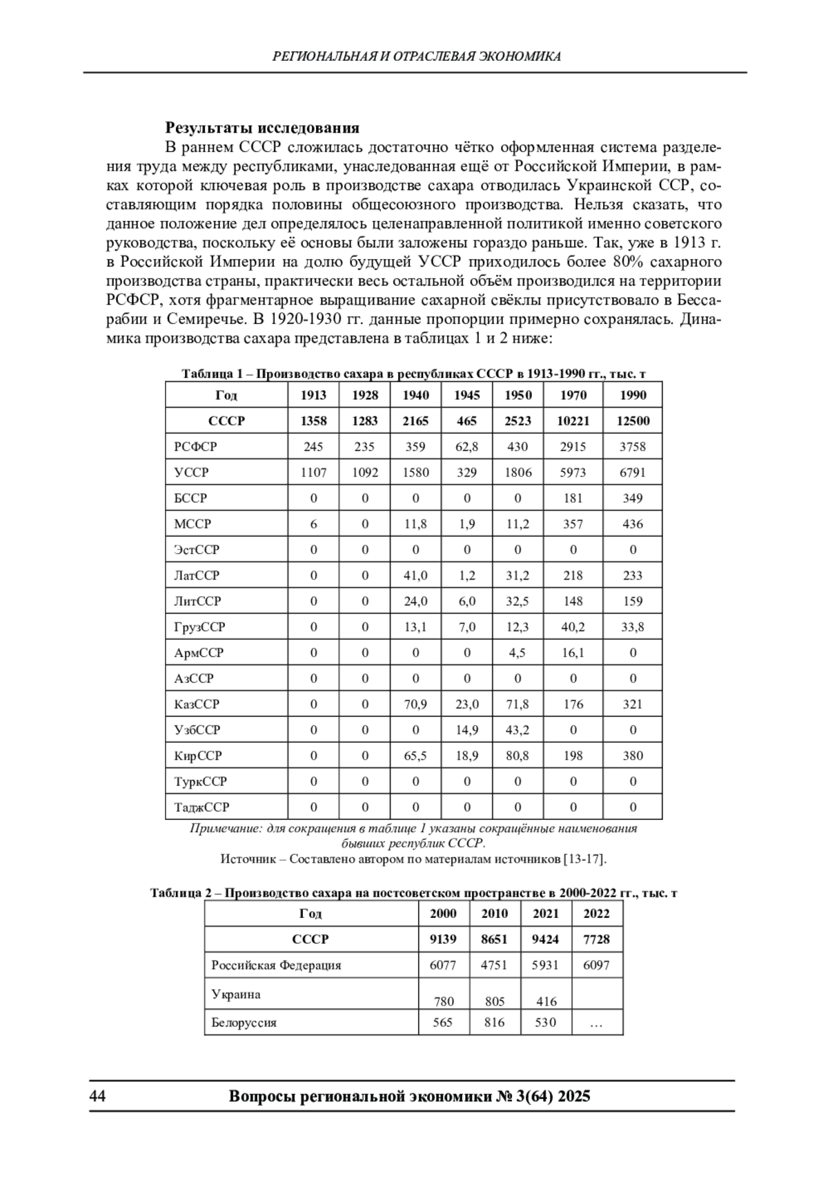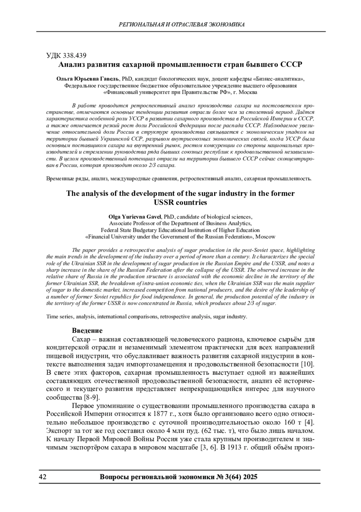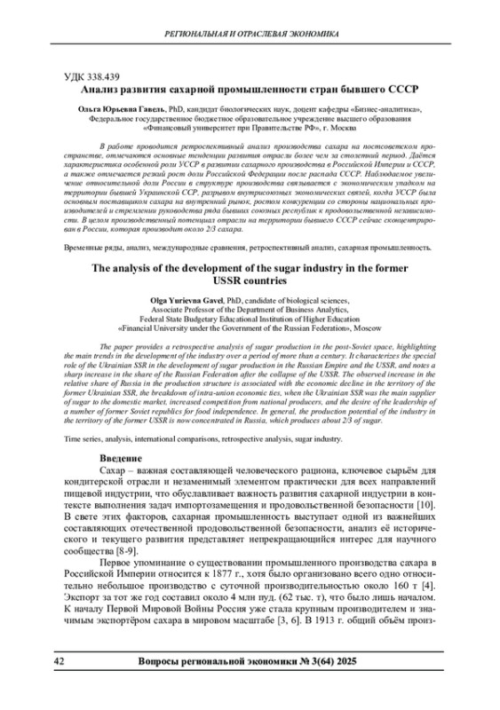 В работе проводится ретроспективный анализ производства сахара на постсоветском пространстве, отмечаются основные тенденции развития отрасли более чем за столетний период. Даётся характеристика особенной роли УССР в развитии сахарного производства в Российской Империи и СССР, а также отмечается резкий рост доли Российской Федерации после распада СССР. Наблюдаемое увеличение относительной доли России в структуре производства связывается с экономическим упадком на территории бывшей Украинской ССР, разрывом внутрисоюзных экономических связей, когда УССР была основным поставщиком сахара на внутренний рынок, ростом конкуренции со стороны национальных производителей и стремлении руководства ряда бывших союзных республик к продовольственной независимости. В целом производственный потенциал отрасли на территории бывшего СССР сейчас сконцентрирован в России, которая производит около 2/3 сахара.