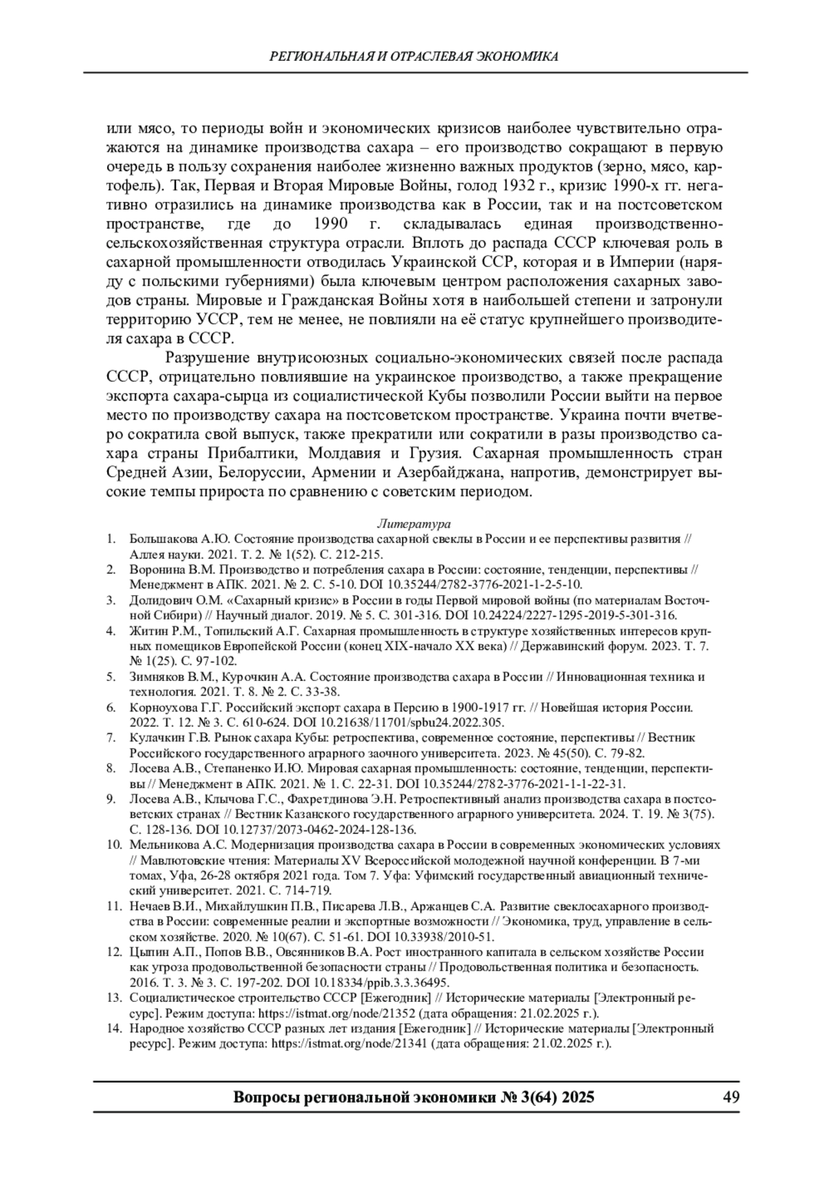 2. Воронина В.М. Производство и потребления сахара в России: состояние, тенденции, перспективы // Менеджмент в АПК. 2021. № 2. С. 5-10. DOI: 10.35244/2782-3776-2021-1-2-5-10 EDN: UQLSEO