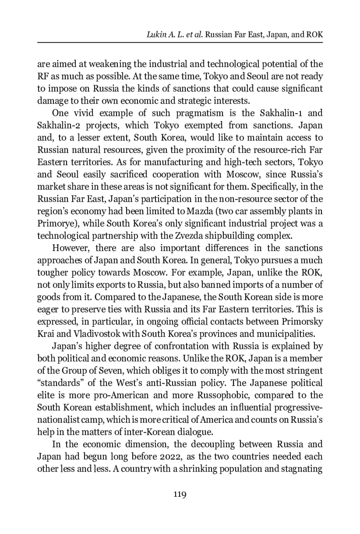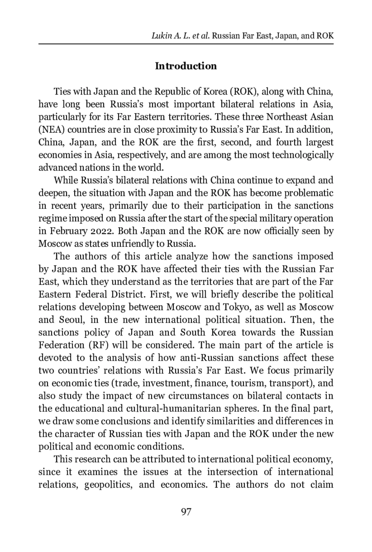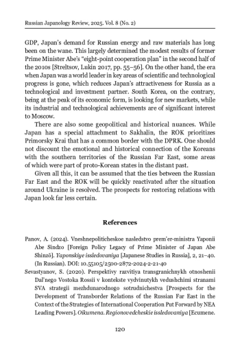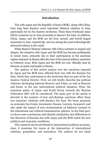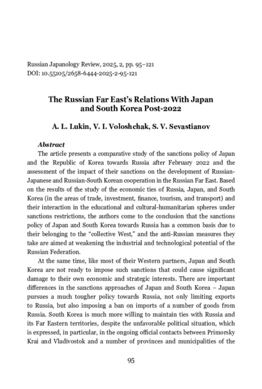 The article presents a comparative study of the sanctions policy of Japan and the Republic of Korea towards Russia after February 2022 and the assessment of the impact of their sanctions on the development of RussianJapanese and Russian-South Korean cooperation in the Russian Far East. Based on the results of the study of the economic ties of Russia, Japan, and South Korea (in the areas of trade, investment, ¿nance, tourism, and transport) and their interaction in the educational and cultural-humanitarian spheres under sanctions restrictions, the authors come to the conclusion that the sanctions policy of Japan and South Korea towards Russia has a common basis due to their belonging to the “collective West,” and the anti-Russian measures they take are aimed at weakening the industrial and technological potential of the Russian Federation. At the same time, like most of their Western partners, Japan and South Korea are not ready to impose such sanctions that could cause signi¿cant damage to their own economic and strategic interests. There are important diɣerences in the sanctions approaches of Japan and South Korea – Japan pursues a much tougher policy towards Russia, not only limiting exports to Russia, but also imposing a ban on imports of a number of goods from Russia. South Korea is much more willing to maintain ties with Russia and its Far Eastern territories, despite the unfavorable political situation, which is expressed, in particular, in the ongoing oɤcial contacts between Primorsky Krai and Vladivostok and a number of provinces and municipalities of the Republic of Korea. The authors suggest that ties between the Russian Far East and South Korea can be quickly restored once the situation around Ukraine is resolved, while the prospects for restoring relations with Japan look much less certain