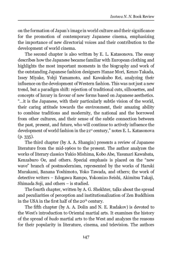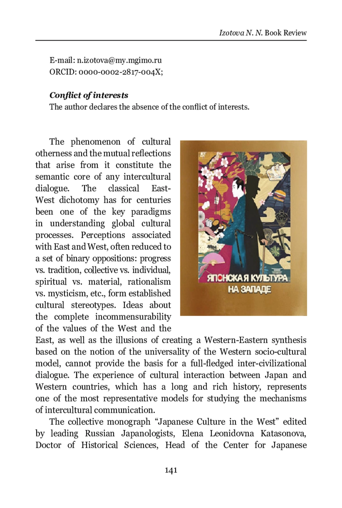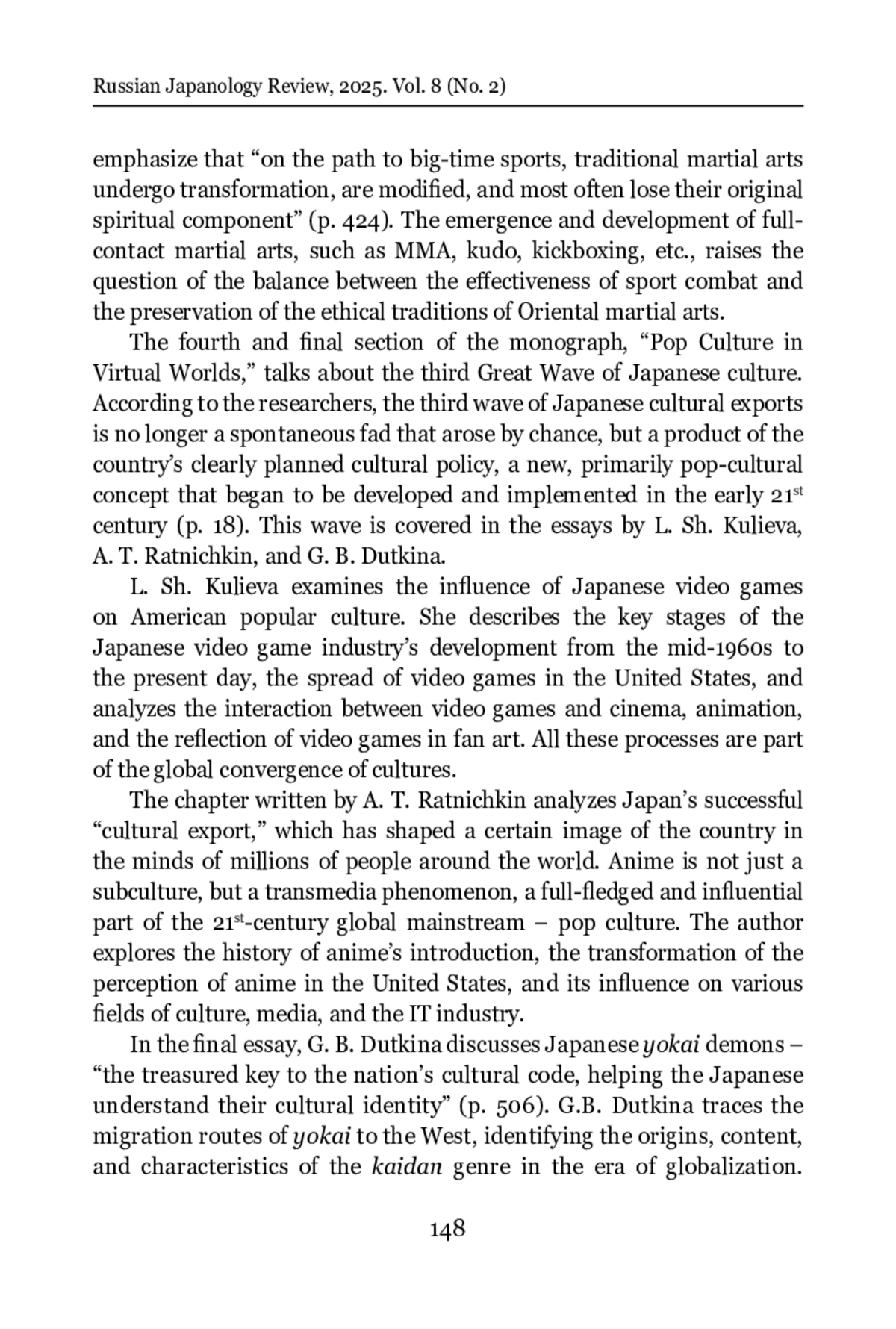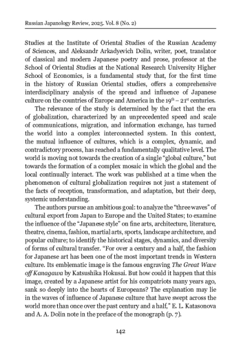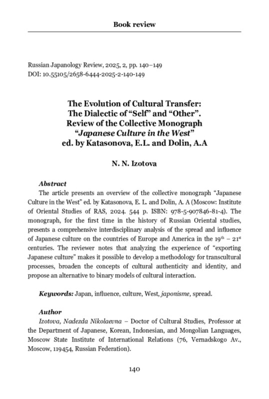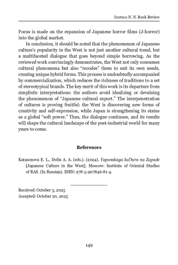 1. Katasonova E. L., Dolin A. A. (eds.). (2024). Yaponskaya kul’tura na Zapade. Moscow: Institute of Oriental Studies of RAS. (In Russian). ISBN: 978-5-907846-81-4.