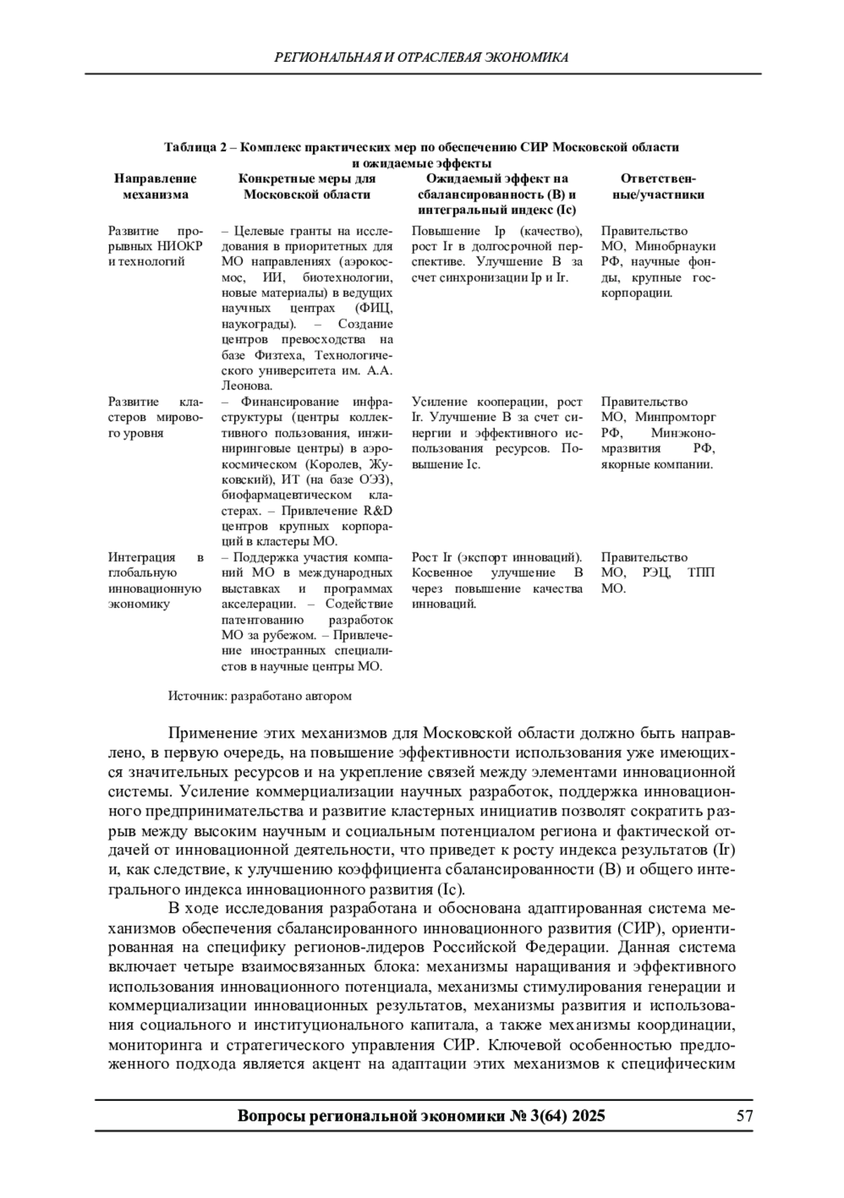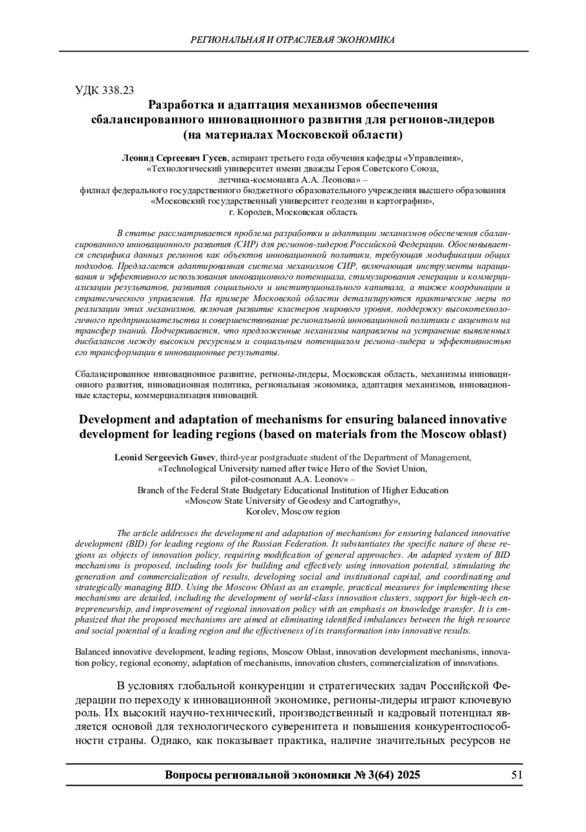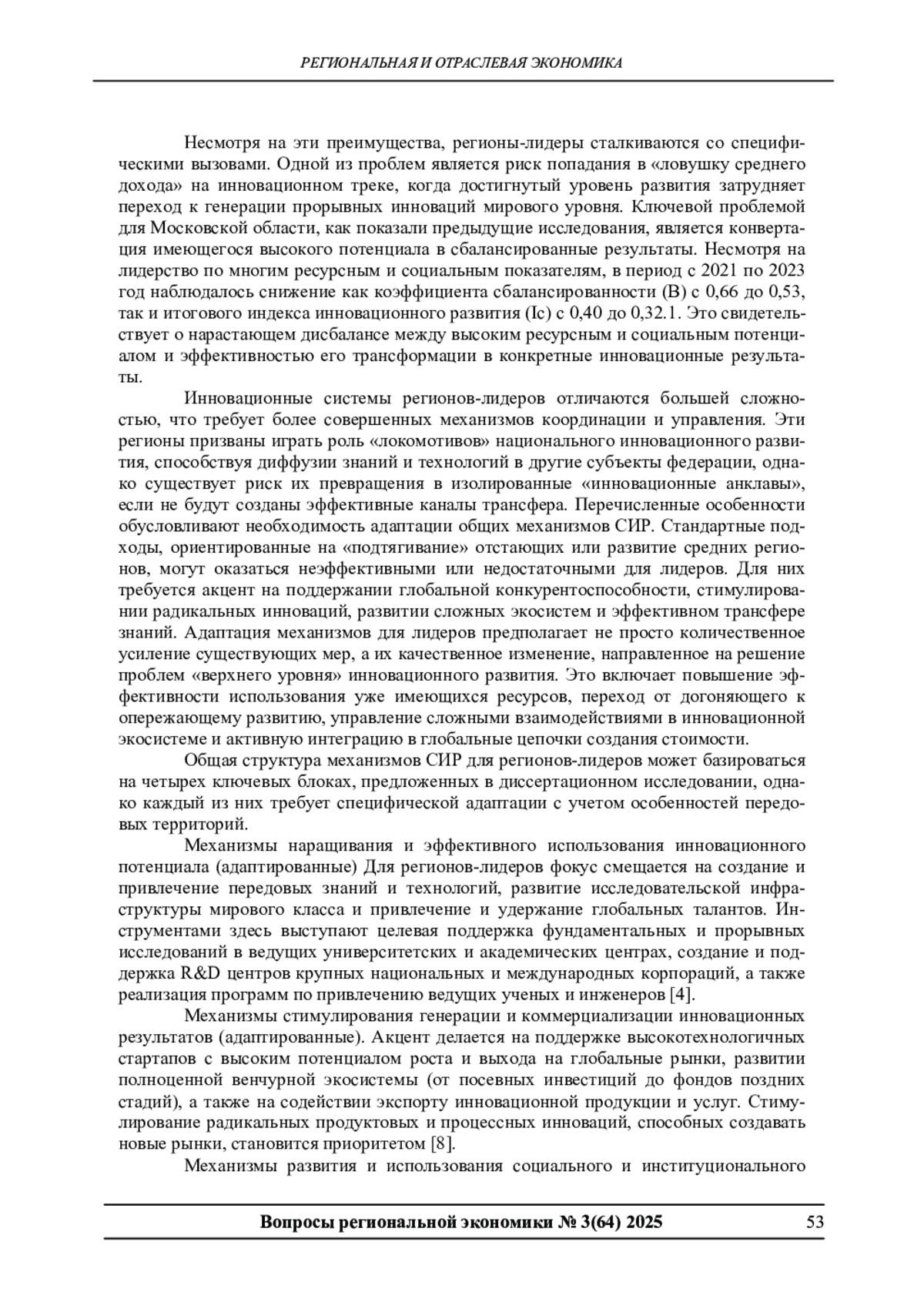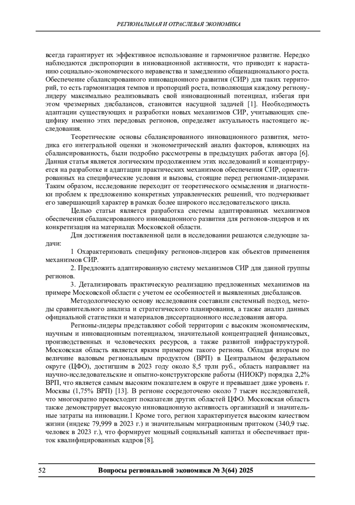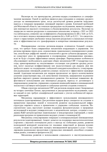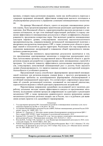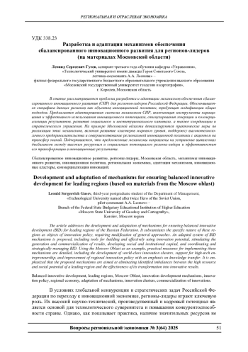 В статье рассматривается проблема разработки и адаптации механизмов обеспечения сбалансированного инновационного развития (СИР) для регионов-лидеров Российской Федерации. Обосновывается специфика данных регионов как объектов инновационной политики, требующая модификации общих подходов. Предлагается адаптированная система механизмов СИР, включающая инструменты наращивания и эффективного использования инновационного потенциала, стимулирования генерации и коммерциализации результатов, развития социального и институционального капитала, а также координации и стратегического управления. На примере Московской области детализируются практические меры по реализации этих механизмов, включая развитие кластеров мирового уровня, поддержку высокотехнологичного предпринимательства и совершенствование региональной инновационной политики с акцентом на трансфер знаний. Подчеркивается, что предложенные механизмы направлены на устранение выявленных дисбалансов между высоким ресурсным и социальным потенциалом региона-лидера и эффективностью его трансформации в инновационные результаты.
