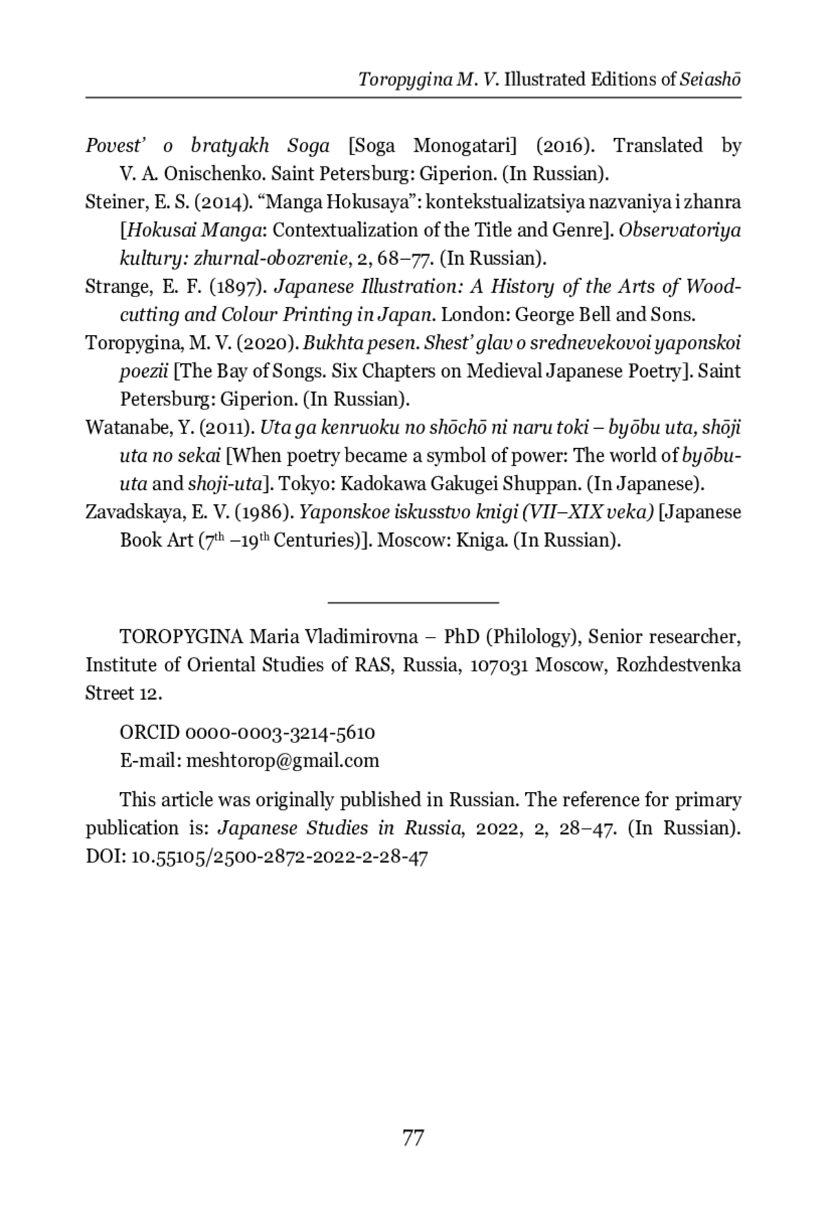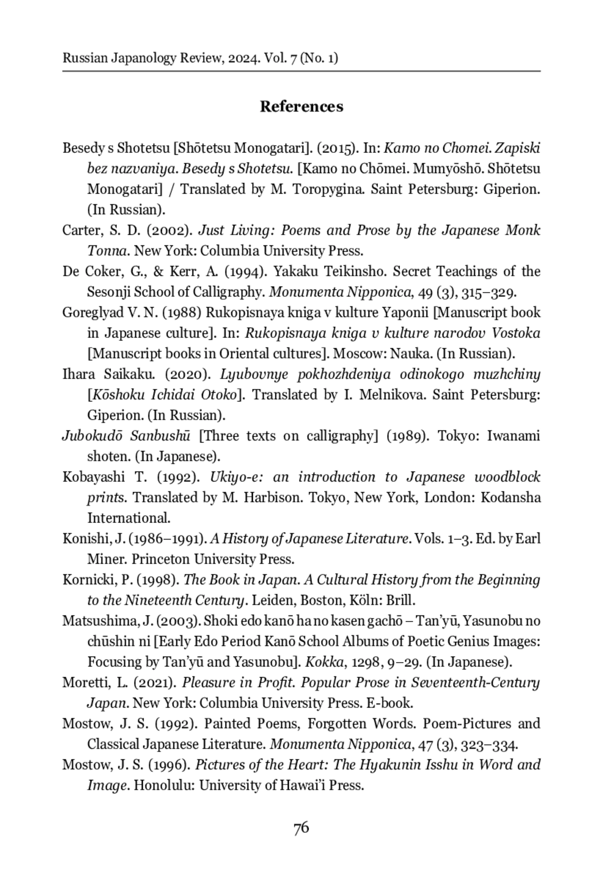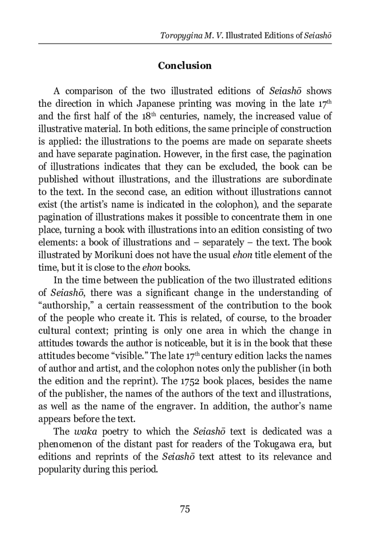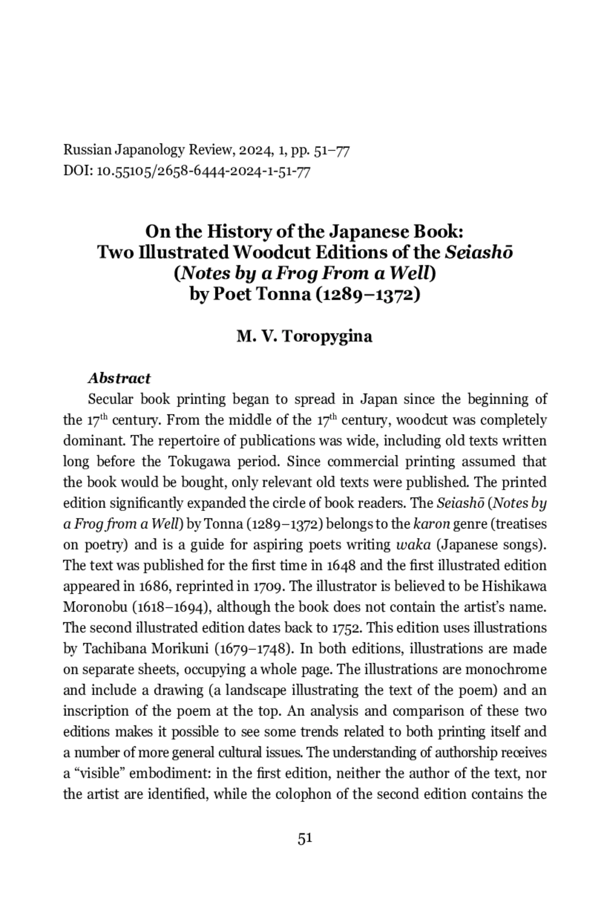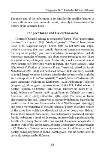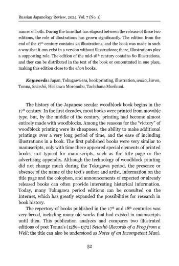 Secular book printing began to spread in Japan since the beginning of the 17 th century. From the middle of the 17 th century, woodcut was completely dominant. The repertoire of publications was wide, including old texts written long before the Tokugawa period. Since commercial printing assumed that the book would be bought, only relevant old texts were published. The printed edition significantly expanded the circle of book readers. The Seiashō (Notes by a Frog from a Well) by Tonna (1289–1372) belongs to the karon genre (treatises on poetry) and is a guide for aspiring poets writing waka (Japanese songs). The text was published for the first time in 1648 and the first illustrated edition appeared in 1686, reprinted in 1709. The illustrator is believed to be Hishikawa Moronobu (1618–1694), although the book does not contain the artist’s name. The second illustrated edition dates back to 1752. This edition uses illustrations by Tachibana Morikuni (1679–1748). In both editions, illustrations are made on separate sheets, occupying a whole page. The illustrations are monochrome and include a drawing (a landscape illustrating the text of the poem) and an inscription of the poem at the top. An analysis and comparison of these two editions makes it possible to see some trends related to both printing itself and a number of more general cultural issues. The understanding of authorship receives a “visible” embodiment: in the first edition, neither the author of the text, nor the artist are identified, while the colophon of the second edition contains the names of both. During the time that has elapsed between the release of these two editions, the role of illustrations has grown significantly. The edition from the end of the 17th century contains 24 illustrations, and the book was made in such a way that it can exist in a version without illustrations; there, illustrations play a supporting role. The edition of the mid-18 th century contains 80 illustrations, and they can be distributed in the text of the book or concentrated in one place, making this edition close to the ehon books