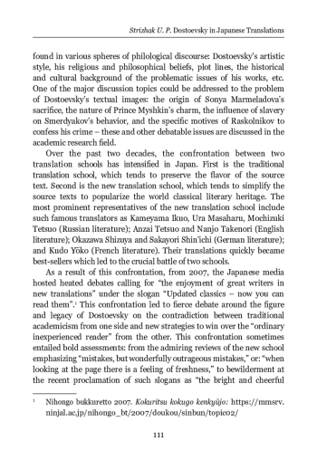 The popularity of Dostoevsky in Japan has traditionally been the subject of study around the world. Translations of his works into Japanese continue to provoke numerous discussions among the translators and literary scholars. The phenomenon of “Japanese Dostoevsky” can be found in various spheres of philological discourse: Dostoevsky’s artistic style, his religious and philosophical beliefs, plot lines, the historical and cultural background of the problematic issues of his works, etc. One of the major discussion topics could be addressed to the problem of Dostoevsky’s textual images: the origin of Sonya Marmeladova’s sacrifice, the nature of Prince Myshkin’s charm, the influence of slavery on Smerdyakov’s behavior, and the specific motives of Raskolnikov to confess his crime – these and other debatable issues are discussed in the academic research field