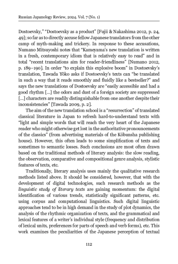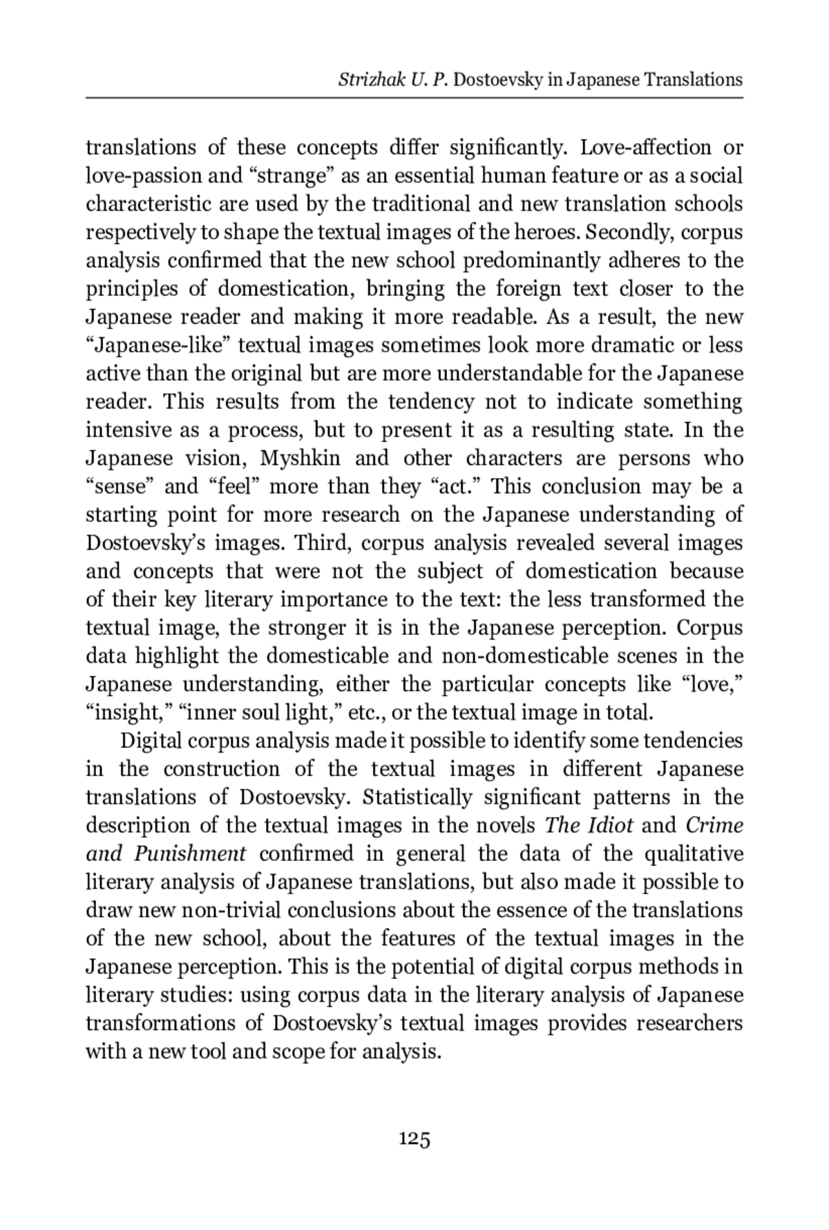 The phenomenon of “Japanese Dostoevsky” is the subject of active discussions in literary studies all over the world. One of the central issues discussed is the problem of the textual images in the works of F. M. Dostoevsky. The use of digital humanities’ technologies, the methods of corpus and computational linguistics makes it possible to formalize literary analysis’ tasks to state the texts’ problems in the language of algorithms. In this article the mechanisms of the transformation of textual images in Dostoevsky works in the Japanese representation will be considered. Different linguistic means are used to analyze the perception of the concept “love” as love-affection or love-passion, and concept “strange” as human essential or social characteristic in Russian and Japanese. Such analysis will help also to highlight the peculiarities of the “new translation school” that adheres to the strategy of domestication, making the foreign text more readable