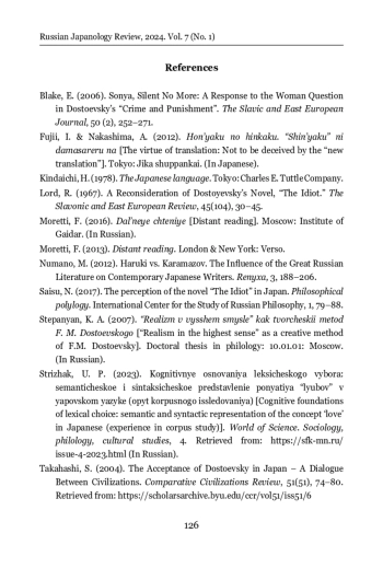 8. Saisu, N. (2017). The perception of the novel “The Idiot” in Japan. Philosophical polylogy. International Center for the Study of Russian Philosophy, 1, 79-88.