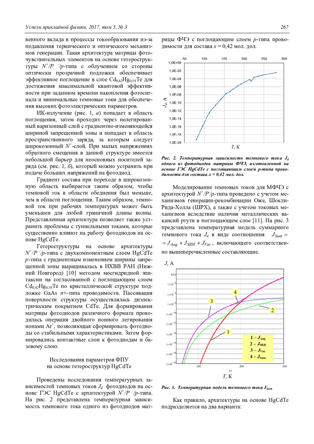 Одной из особенностей архитектуры МФЧЭ является то, что р–n-переход формируется в более широкозонной области структуры, состав которой выбирается большим (х > 0,45 мол. дол.), чем состав в поглощающей области Cd0,42Hg0,58Te (х ≈ 0,42 мол. дол.). Основная часть излучения поглощается в слаболегированной области поглощения р-типа проводимости, концентрация легирующей примеси в которой выбрана таким образом, чтобы максимально подавить механизмы Оже-7 и Шокли-Рида-Холла. В результате темновые токи существенно уменьшаются (Id ≈ 10-8– 10-12 А), что позволяет ФПУ работать при повышенных температурах Т = 170–200 К, обеспечивая при этом высокую обнаружительную способность D* 5.×1012 см Вт-1 Гц1/2 в максимуме спектральной чувствительности.