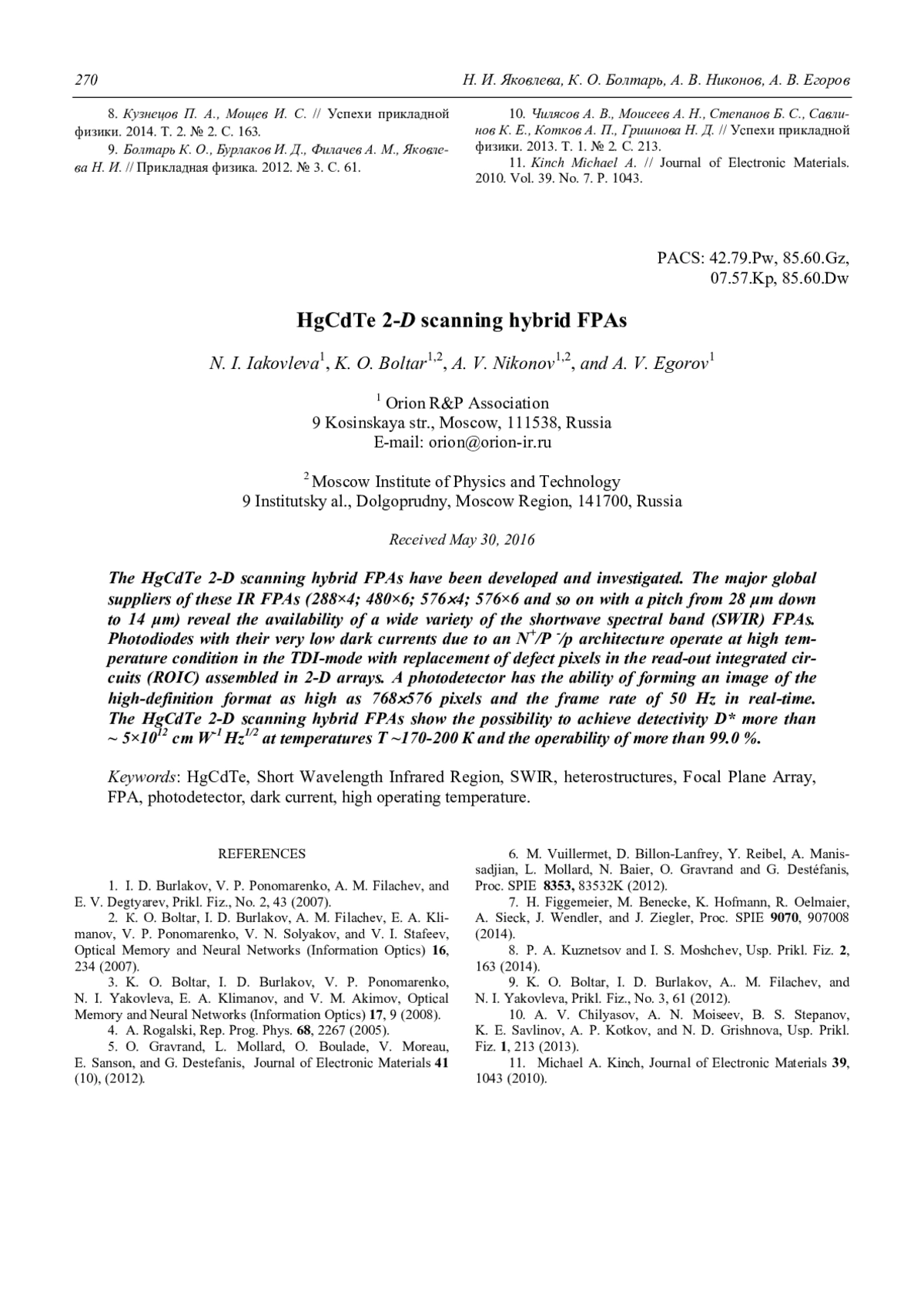 9. Болтарь К. О., Бурлаков И. Д., Филачев А. М., Яковлева Н. И. // Прикладная физика. 2012. № 3. С. 61.