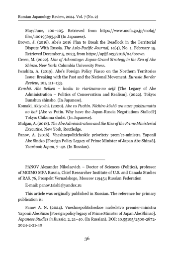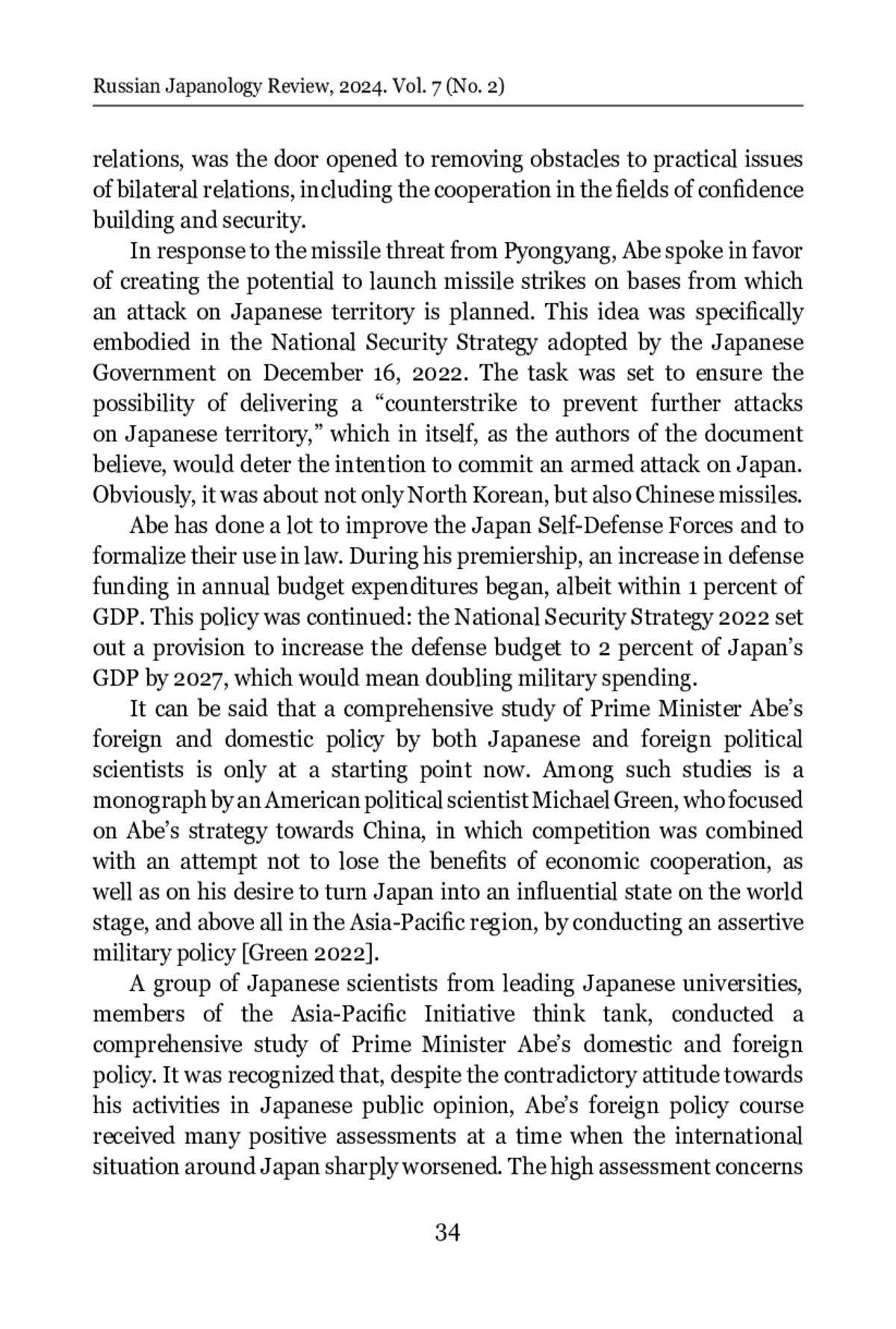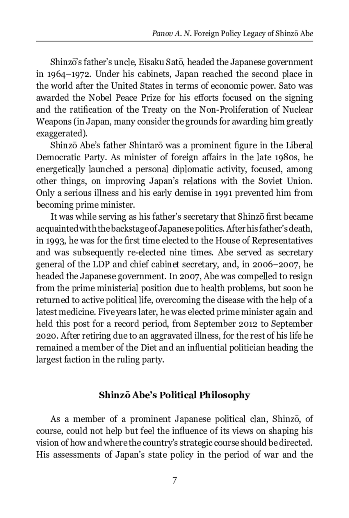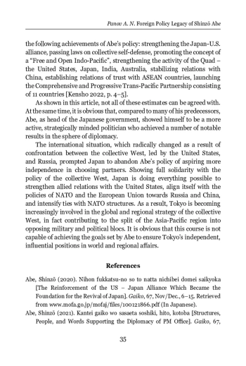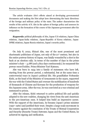The article analyzes the foreign policy of Shinzō Abe, one of the most notable and unusual political figures of contemporary Japan, who was the head of Japanese government twice for a total of almost nine years. It traces how his political philosophy formed under the influence of ideological views of his relatives, prime ministers N. Kishi and E. Satō, as well as his father, Shintarō Abe. It also considers Abe’s approaches to building Japan’s relations with the countries which are most important for its interests. Abe was perceived as a devoted ally of the U. S. in Washington. He established relations of confidence with presidents Obama and Trump. For this purpose, he strengthened Japanese-American military-political cooperation, took steps to support American strategy in the Asia-Pacific region. He implemented, even if without substantial results, steps to stabilize relations with China, trying to combine policy of containing Beijing with efforts to develop bilateral ties. Abe paid substantial attention to relations with India, including for the purpose of the idea, which was put forward by him and supported by the U. S., to establish quadrilateral cooperation of “democracies” in the Indo-Pacific region – the U. S., Japan, India, and Australia. His policy in the Korean direction was not successful. The relations with Pyongyang remained in deadlock, and, with Seoul, the most acute bilateral problems were not finally solved. Abe also paid great attention to policy aiming to conclude a peace treaty with Russia on the basis of a radical improvement of Japanese-Russian ties in all spheres. The reasons for his failure in t hese directions are discussed in this article The article evaluates Abe’s efforts aimed at developing governmental documents and making the Diet adopt laws determining the basic directions of the foreign and military policy of the state. The author characterizes the results of the activity of S. Abe in the sphere of foreign policy and assesses its influence on the formation of the course of the Japanese government after his resignation