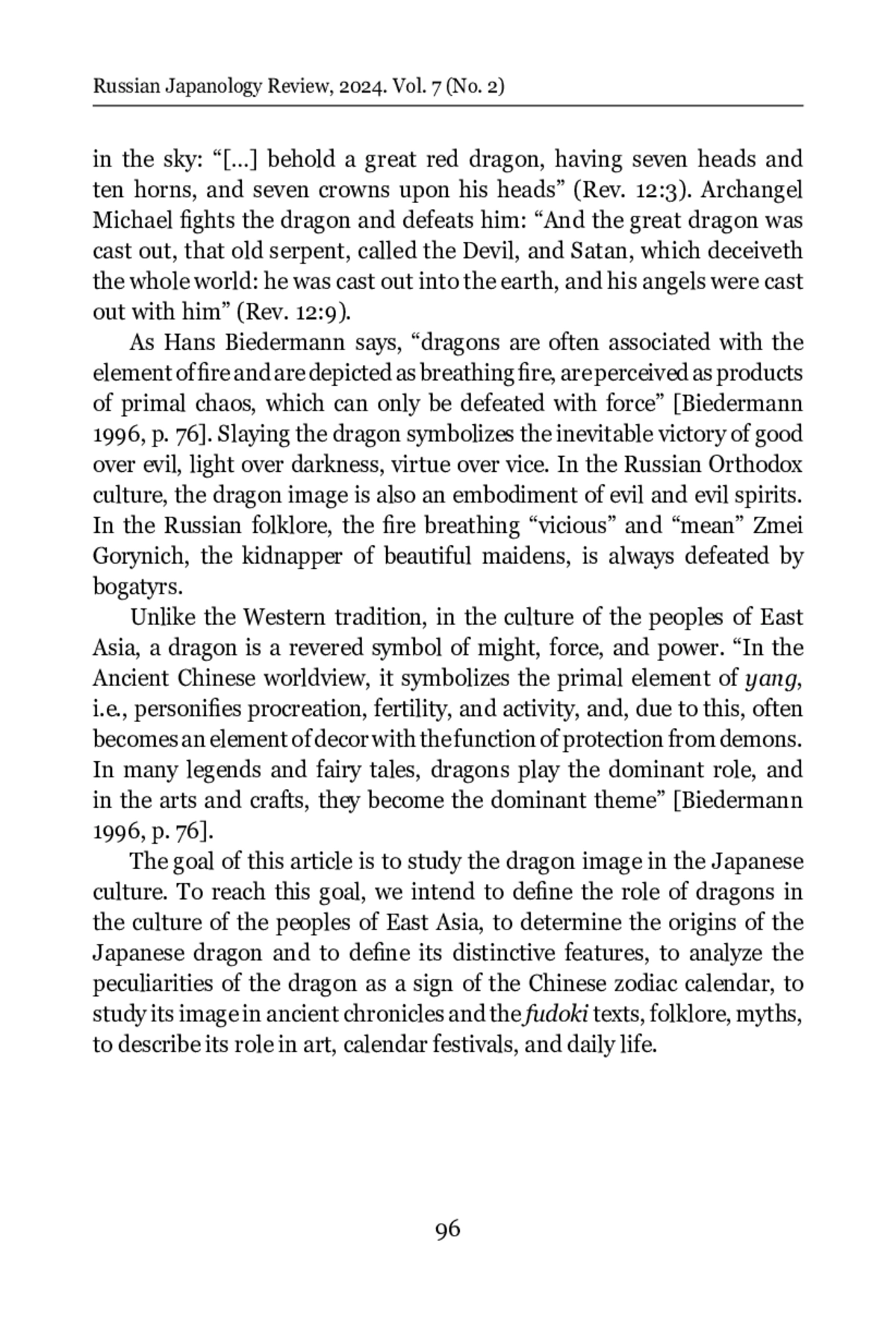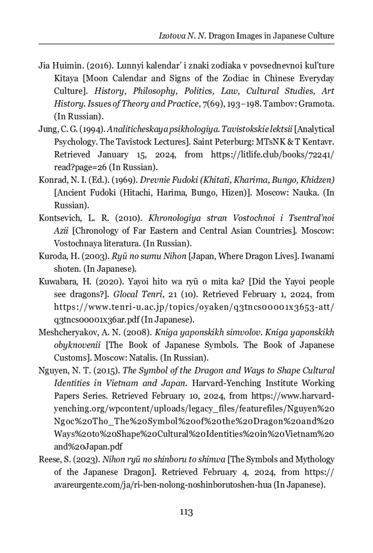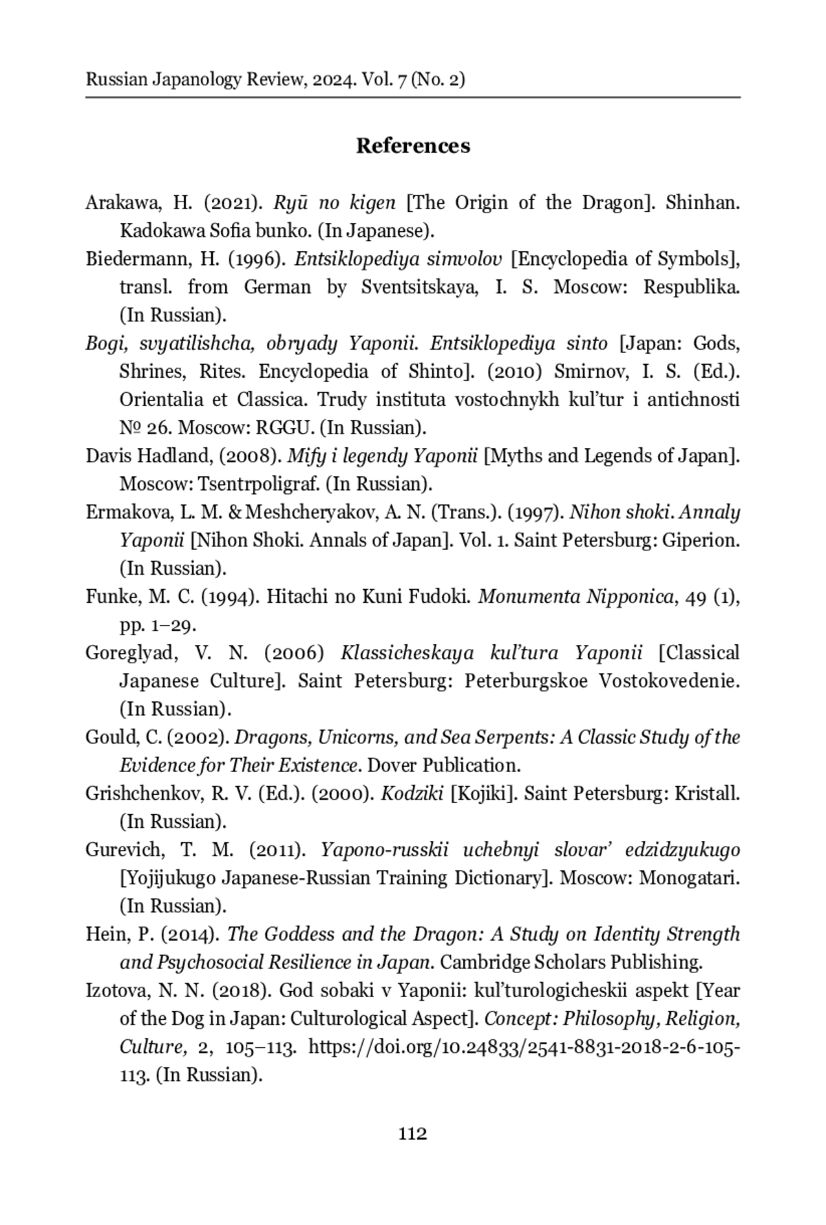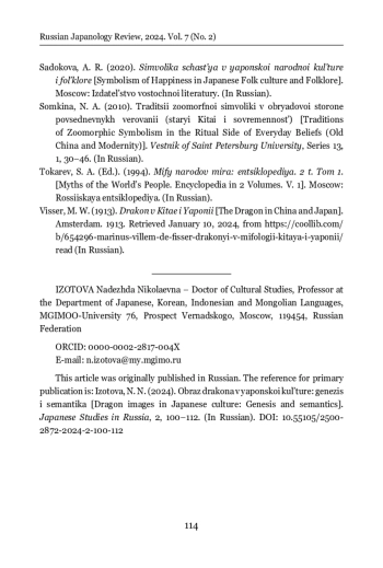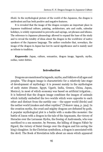 The article deals with the genesis, semantics, and functions of the dragon image in Japanese culture. The relevance of the study is due to the increased attention of researchers to the basic values of local cultures, issues of symbolism, inextricably linked to the problems of national self-identification. The methodological basis of the study is the structural-semiotic approach, which was used to analyze the value content of the dragon image, the descriptive-analytical method, and the method of cognitive interpretation of the semantics of linguistic means verbalizing the dragon image in the Japanese language. In contrast to the Western tradition, in the culture of the peoples of East Asia, a dragon is a revered and significant symbol of power, strength, and authority. Stories about dragons are found in ancient texts of both Hinduism and Buddhism. It is established that the formation and evolution of the dragon cult in Japan was influenced by the mythical Chinese dragons, Indian Naga snakes, and the belief in dragons as deities of the water element. The author examines the genesis and evolution of the dragon image in different historical epochs, the influence of cultural-historical, natural, and religious factors on its transformation. It is shown that, in medieval Japan, the dragon was considered the protector of Buddhism, personifying strength, wisdom, prosperity, good luck, and images of these mythical creatures became an organic element of Buddhist culture. Particular attention is paid to the analysis of the image of the dragon as a sign of the Chinese zodiacal calendar, the representations of dragons in Japanese mythology, fairy tales and legends, in Hitachi Fudoki, Kojiki, Nihon Shoki. In the mythological picture of the world of the Japanese, the dragon is ambivalent and has both positive and negative features. It is revealed that the image of the dragon occupies an important place in Japanese traditional culture, painting, architecture, arts and crafts, calendar holidays, is widely represented in proverbs and sayings, set phrases and idioms. The reference to Japanese phraseology allowed to expand the base of the study and to reveal the totality of ideas about the dragon in the worldview of native speakers of the Japanese language. The author concludes that, nowadays, the image of the dragon in Japan has lost its sacral significance and is mainly used as tribute to tradition