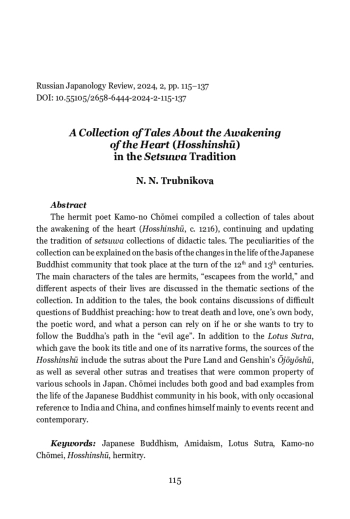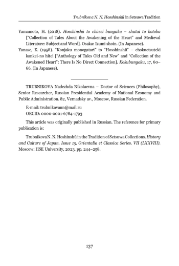 31. Trubnikova, N. N. (2021). Buddizm i yaponskaya poeziya v “Sobranii pesen o probuzhdenii serdtsa”. Sobranie pesen o probuzhdenii serdtsa. Trans. and comments by N. N. Trubnikova. In Italya i kul’tura Yaponii 13(pp. 32-77). Moscow: Higher School of Economics. (In Russian).