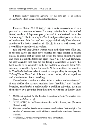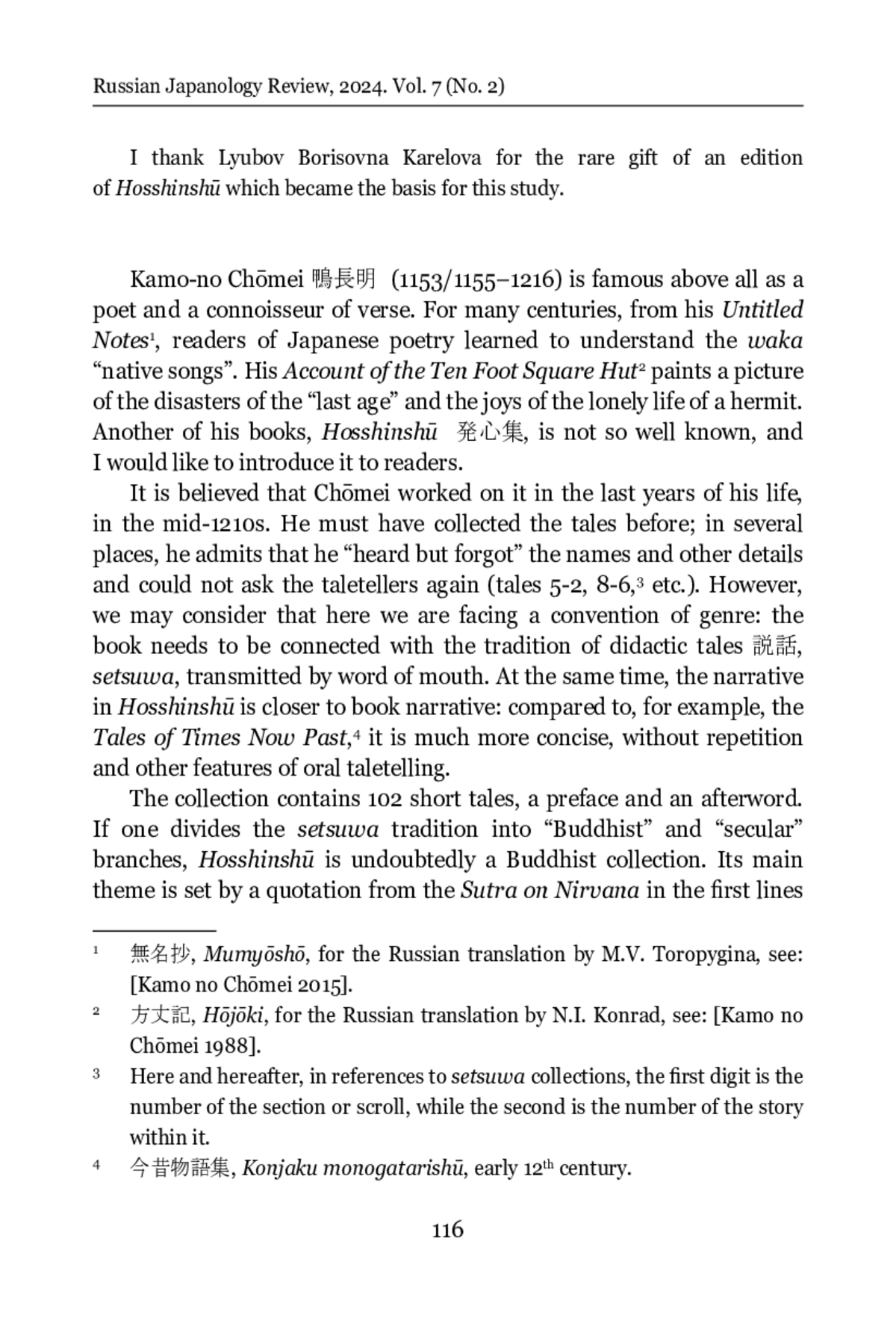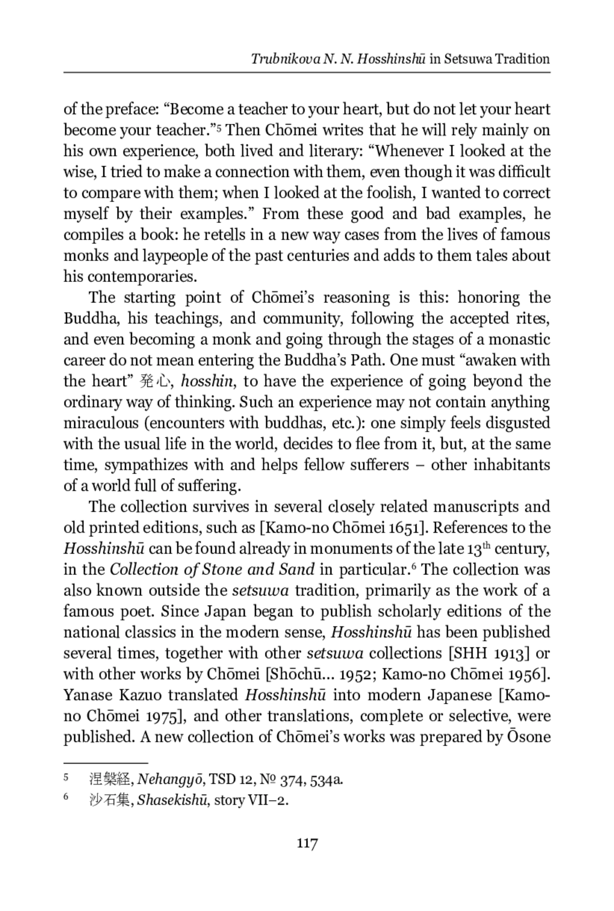The hermit poet Kamo-no Chō mei compiled a collection of tales about the awakening of the heart (Hosshinshū, c. 1216), continuing and updating the tradition of setsuwa collections of didactic tales. The peculiarities of the collection can be explained on the basis of the changes in the life of the Japanese Buddhist community that took place at the turn of the 12 th and 13 th centuries. The main characters of the tales are hermits, “escapees from the world,” and different aspects of their lives are discussed in the thematic sections of the collection. In addition to the tales, the book contains discussions of difficult questions of Buddhist preaching: how to treat death and love, one’s own body, the poetic word, and what a person can rely on if he or she wants to try to follow the Buddha’s path in the “evil age”. In addition to the Lotus Sutra, which gave the book its title and one of its narrative forms, the sources of the Hosshinshū include the sutras about the Pure Land and Genshin’s Ōjō y ō shū, as well as several other sutras and treatises that were common property of various schools in Japan. Chō mei includes both good and bad examples from the life of the Japanese Buddhist community in his book, with only occasional reference to India and China, and confines himself mainly to events recent and contemporary
