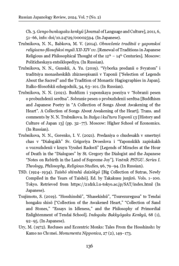 30. Trubnikova, N. N., Gunskii, A. Yu. (2019). “Vyborka predanii o Svyatom” i traditsiya monasheskikh zhizneopisanii v Yaponii. Italko- losofskii ezhegodnik, 34, 63-101. (In Russian).