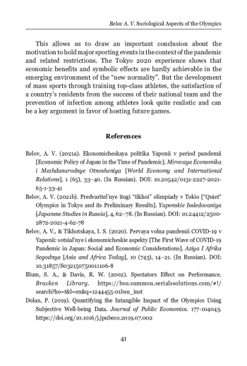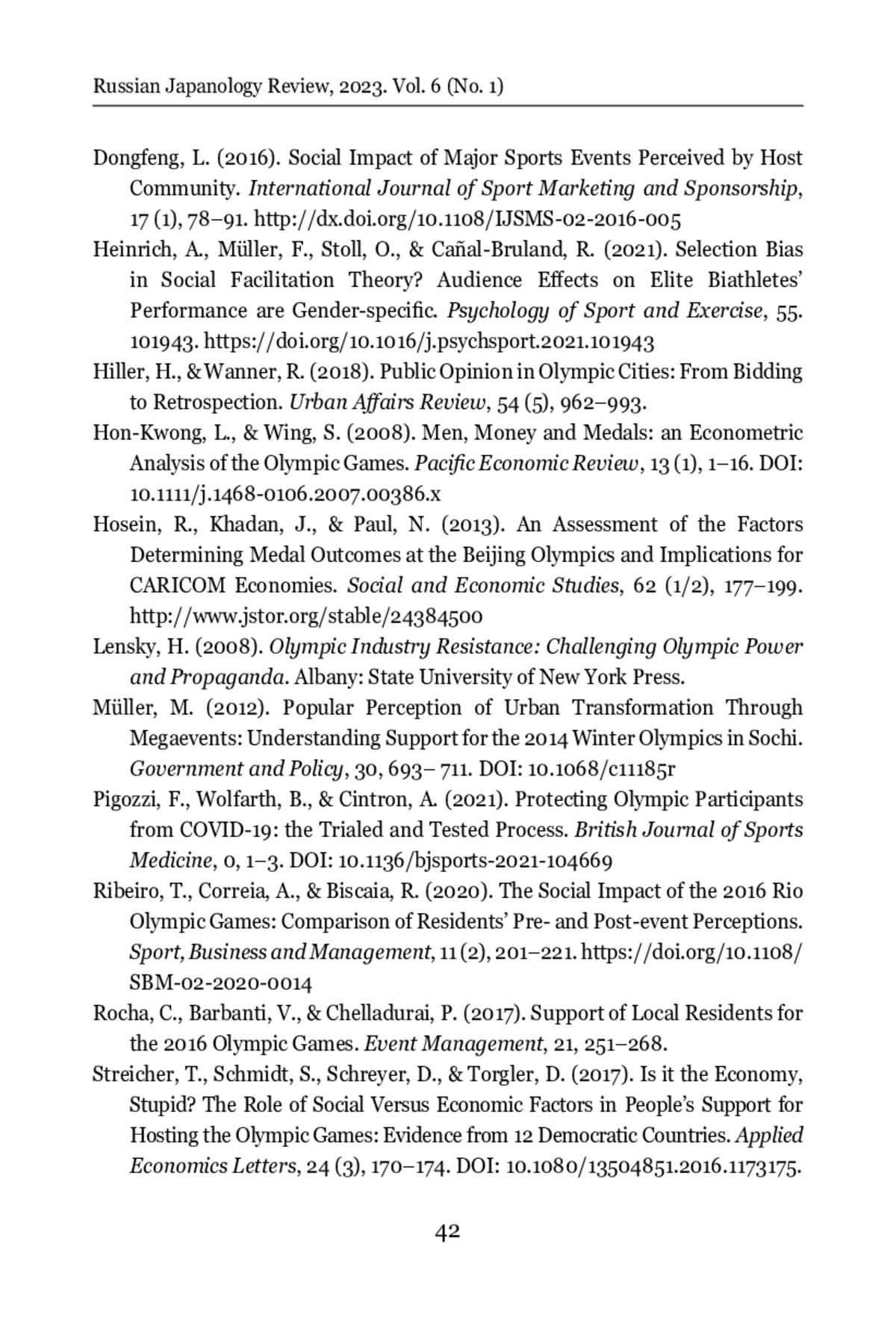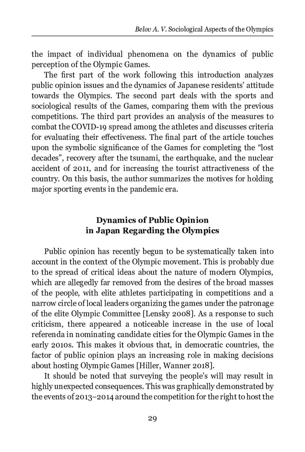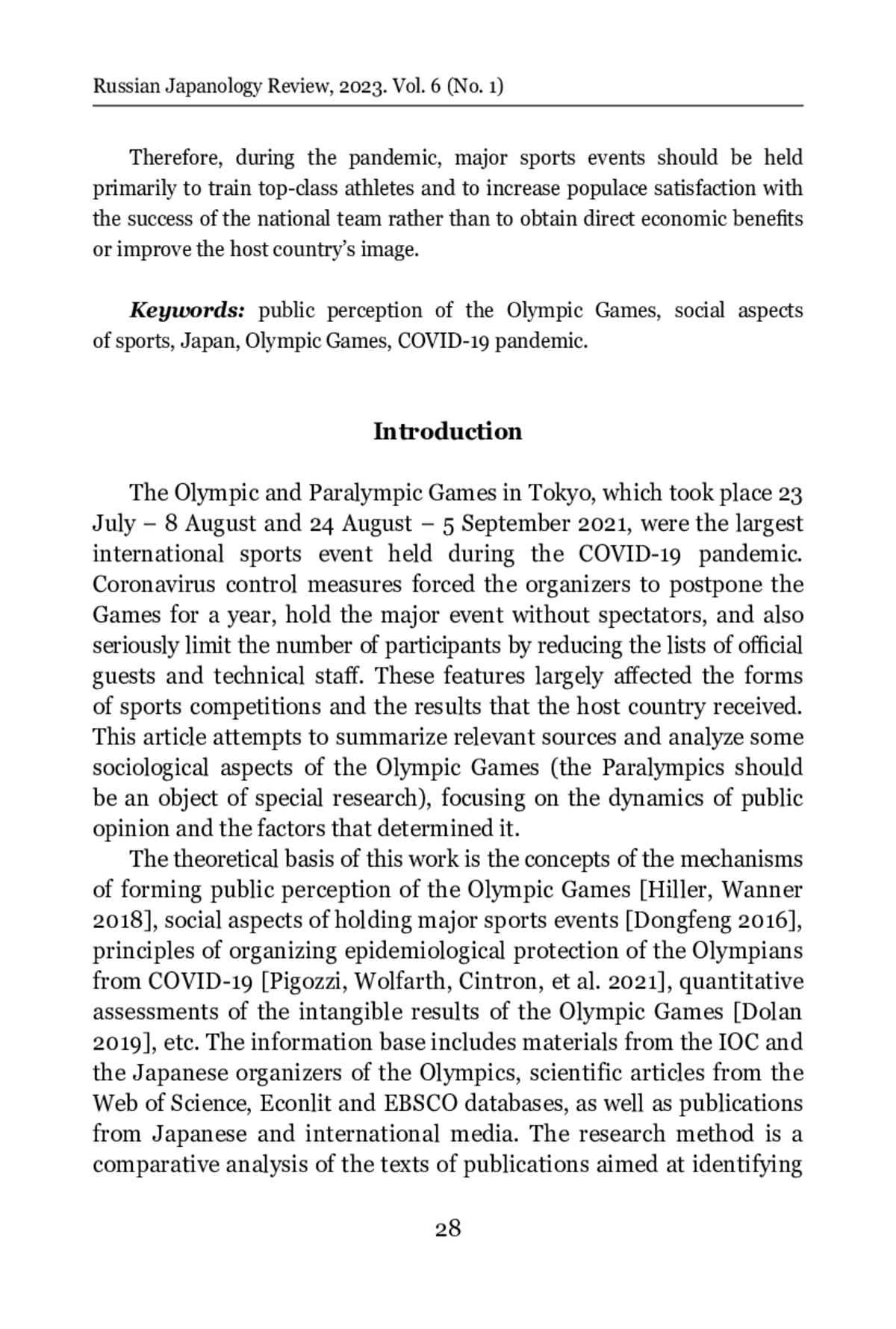 The Olympic and Paralympic Games in Tokyo in July–September 2021 took place in a challenging social environment that seriously affected the public perception of the events. When preparing for the Olympics from 2013–2019, the Japanese people actively supported the Games, which was confirmed by the results of numerous sociological studies. In March 2020, the COVID-19 pandemic began, followed by several waves of infection spread. The competition was postponed for a year. Vaccination in Japan was delayed compared with most of the G7 countries. Against this background, in the summer of 2021, the most dangerous Delta strain of coronavirus began to spread in the country, bringing a rise in mortality rates and overcrowding in hospitals in large cities. In this difficult epidemiological and social situation, surveys recorded a negative attitude towards the Olympics. However, during the competition, the majority opinion once again turned positive, mainly due to the athletic successes of the Japanese team and effective anti-virus control measures. The absence of spectators in the venues, most probably, did not affect the sporting achievements significantly. At least, the Japanese Olympic team won a record number of medals. Infection prevention measures proved effective in limiting the transmission of the virus among the athletes and the Japanese service personnel. The economic and symbolic achievements of the Games did not meet expectations, as, during the Olympics, it was not possible to properly address its significance as the end point of the low-growth “lost decades”, evidence of economic recovery after the triple disaster of 2011, and as a tool to increase Japan’s tourist attractiveness. Therefore, during the pandemic, major sports events should be held primarily to train top-class athletes and to increase populace satisfaction with the success of the national team rather than to obtain direct economic benefits or improve the host country’s image