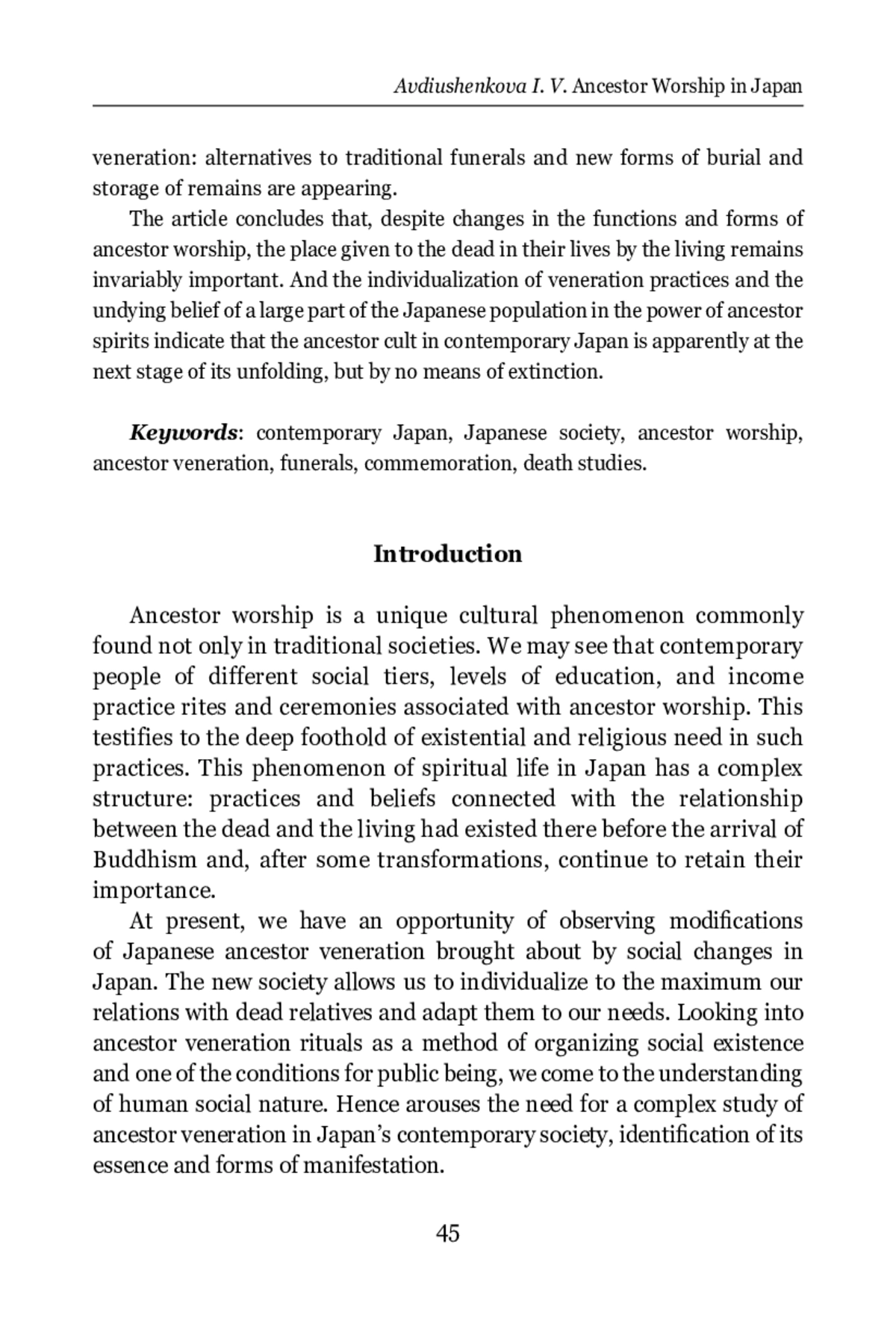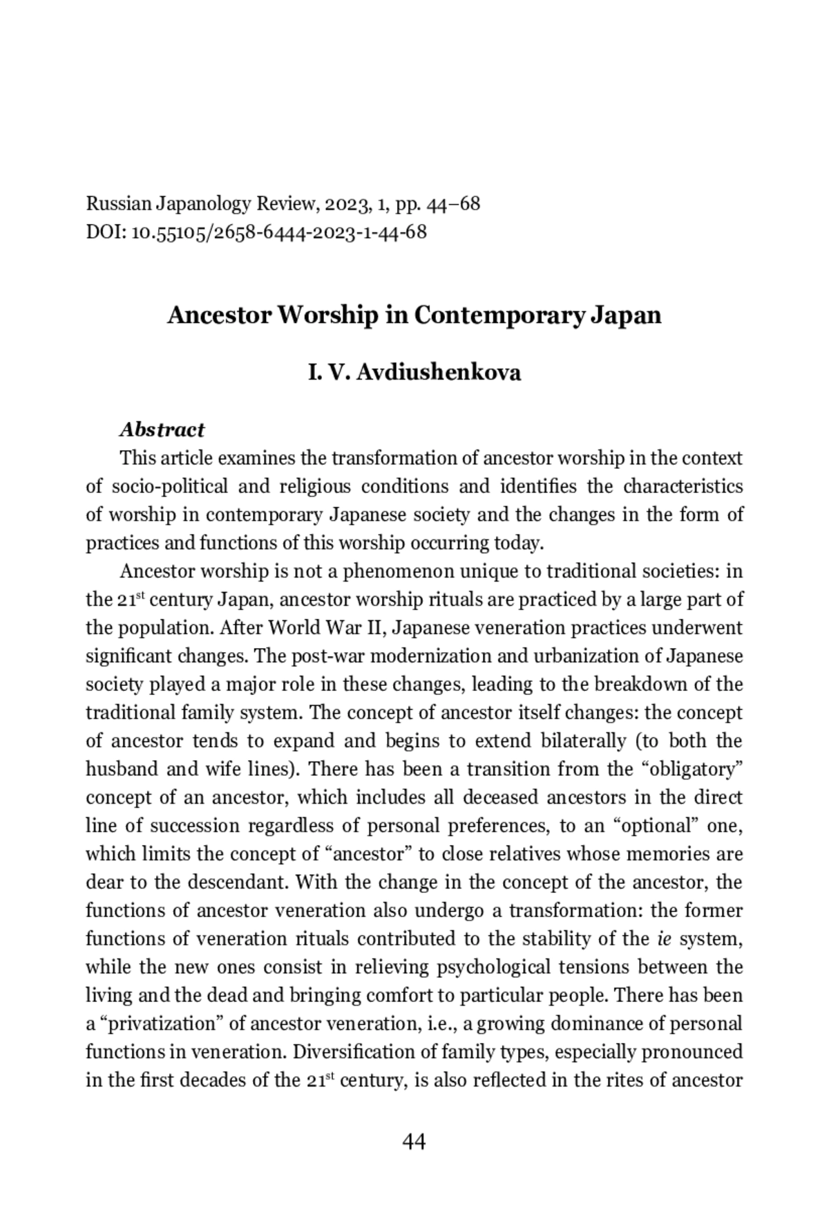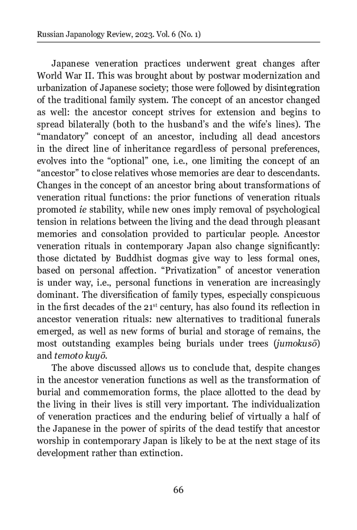 This article examines the transformation of ancestor worship in the context of socio-political and religious conditions and identifies the characteristics of worship in contemporary Japanese society and the changes in the form of practices and functions of this worship occurring today. Ancestor worship is not a phenomenon unique to traditional societies: in the 21 st century Japan, ancestor worship rituals are practiced by a large part of the population. After World War II, Japanese veneration practices underwent significant changes. The post-war modernization and urbanization of Japanese society played a major role in these changes, leading to the breakdown of the traditional family system. The concept of ancestor itself changes: the concept of ancestor tends to expand and begins to extend bilaterally (to both the husband and wife lines). There has been a transition from the “obligatory” concept of an ancestor, which includes all deceased ancestors in the direct line of succession regardless of personal preferences, to an “optional” one, which limits the concept of “ancestor” to close relatives whose memories are dear to the descendant. With the change in the concept of the ancestor, the functions of ancestor veneration also undergo a transformation: the former functions of veneration rituals contributed to the stability of the ie system, while the new ones consist in relieving psychological tensions between the living and the dead and bringing comfort to particular people. There has been a “privatization” of ancestor veneration, i. e., a growing dominance of personal functions in veneration. Diversification of family types, especially pronounced in the first decades of the 21st century, is also reflected in the rites of ancestor veneration: alternatives to traditional funerals and new forms of burial and storage of remains are appearing. The article concludes that, despite changes in the functions and forms of ancestor worship, the place given to the dead in their lives by the living remains invariably important. And the individualization of veneration practices and the undying belief of a large part of the Japanese population in the power of ancestor spirits indicate that the ancestor cult in contemporary Japan is apparently at the next stage of its unfolding, but by no means of extinction
