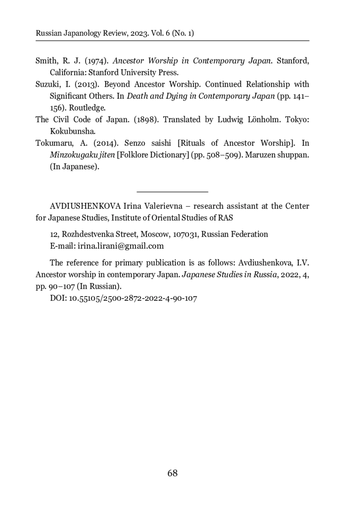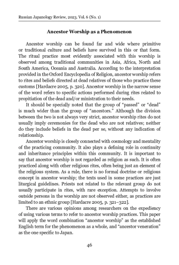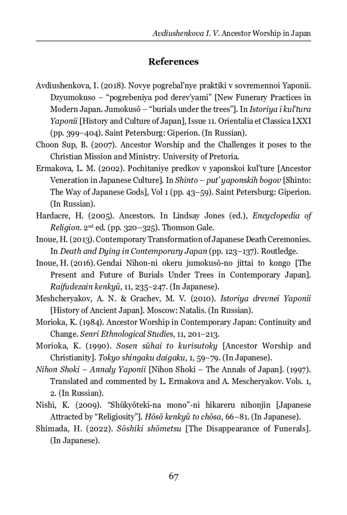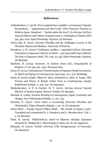 This article examines the transformation of ancestor worship in the context of socio-political and religious conditions and identifies the characteristics of worship in contemporary Japanese society and the changes in the form of practices and functions of this worship occurring today. Ancestor worship is not a phenomenon unique to traditional societies: in the 21 st century Japan, ancestor worship rituals are practiced by a large part of the population. After World War II, Japanese veneration practices underwent significant changes. The post-war modernization and urbanization of Japanese society played a major role in these changes, leading to the breakdown of the traditional family system. The concept of ancestor itself changes: the concept of ancestor tends to expand and begins to extend bilaterally (to both the husband and wife lines). There has been a transition from the “obligatory” concept of an ancestor, which includes all deceased ancestors in the direct line of succession regardless of personal preferences, to an “optional” one, which limits the concept of “ancestor” to close relatives whose memories are dear to the descendant. With the change in the concept of the ancestor, the functions of ancestor veneration also undergo a transformation: the former functions of veneration rituals contributed to the stability of the ie system, while the new ones consist in relieving psychological tensions between the living and the dead and bringing comfort to particular people. There has been a “privatization” of ancestor veneration, i. e., a growing dominance of personal functions in veneration. Diversification of family types, especially pronounced in the first decades of the 21st century, is also reflected in the rites of ancestor veneration: alternatives to traditional funerals and new forms of burial and storage of remains are appearing. The article concludes that, despite changes in the functions and forms of ancestor worship, the place given to the dead in their lives by the living remains invariably important. And the individualization of veneration practices and the undying belief of a large part of the Japanese population in the power of ancestor spirits indicate that the ancestor cult in contemporary Japan is apparently at the next stage of its unfolding, but by no means of extinction