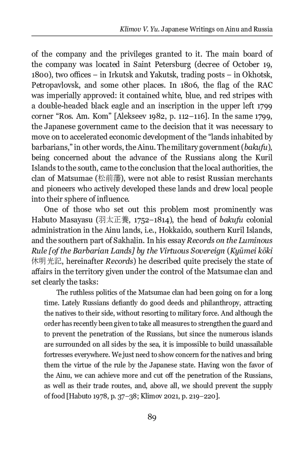 The year of 1799 can be considered a milestone in relations between Russia and Japan in the late 18 th and early 19th centuries. In Russia, the Russian-American Company (RAC) was established this year at the initiative of Irkutsk merchants. On July 8, 1799, Emperor Paul I (1754– 1801, reign 1796–1801) signed a decree to the Senate on the foundation of the company and the privileges granted to it. The main board of the company was located in Saint Petersburg (decree of October 19, 1800), two offices – in Irkutsk and Yakutsk, trading posts – in Okhotsk, Petropavlovsk, and some other places. In 1806, the flag of the RAC was imperially approved: it contained white, blue, and red stripes with a double-headed black eagle and an inscription in the upper left 1799 corner “Ros. Am. Kom” [Alekseev 1982, p. 112–116]. In the same 1799, the Japanese government came to the decision that it was necessary to move on to accelerated economic development of the “lands inhabited by barbarians,” in other words, the Ainu. The military government (bakufu), being concerned about the advance of the Russians along the Kuril Islands to the south, came to the conclusion that the local authorities, the clan of Matsumae (松前藩), were not able to resist Russian merchants and pioneers who actively developed these lands and drew local people into their sphere of influence