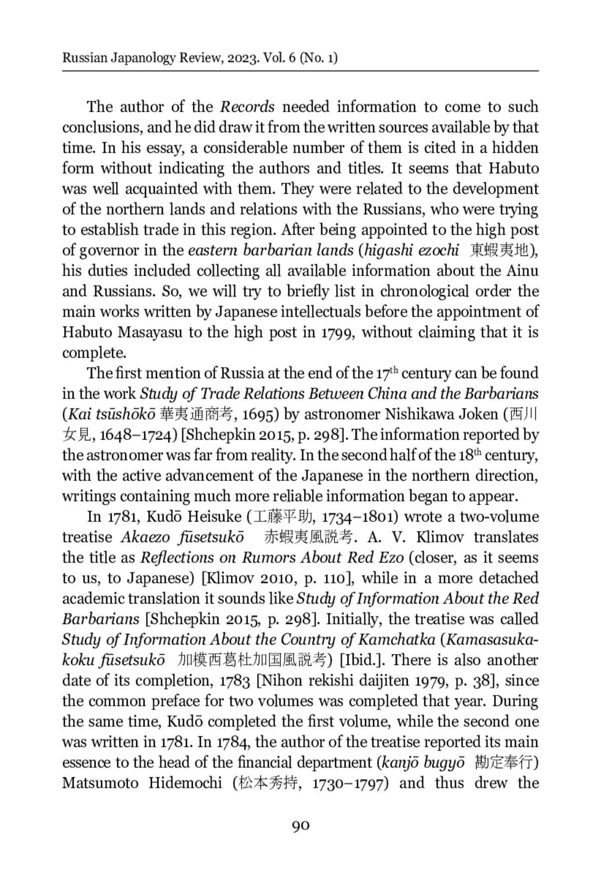 15. Shchepkin, V. V. (2020). Ot “krasnykh lyudey” k “sosednemu gosudarstvu”: Matsudayra Sadanobu i Rossiya. In Istoriya i kul’tura traditsionnoi Yaponii 12. Orientalia et Classica LXXII. Moscow: HSE University. (In Russian).