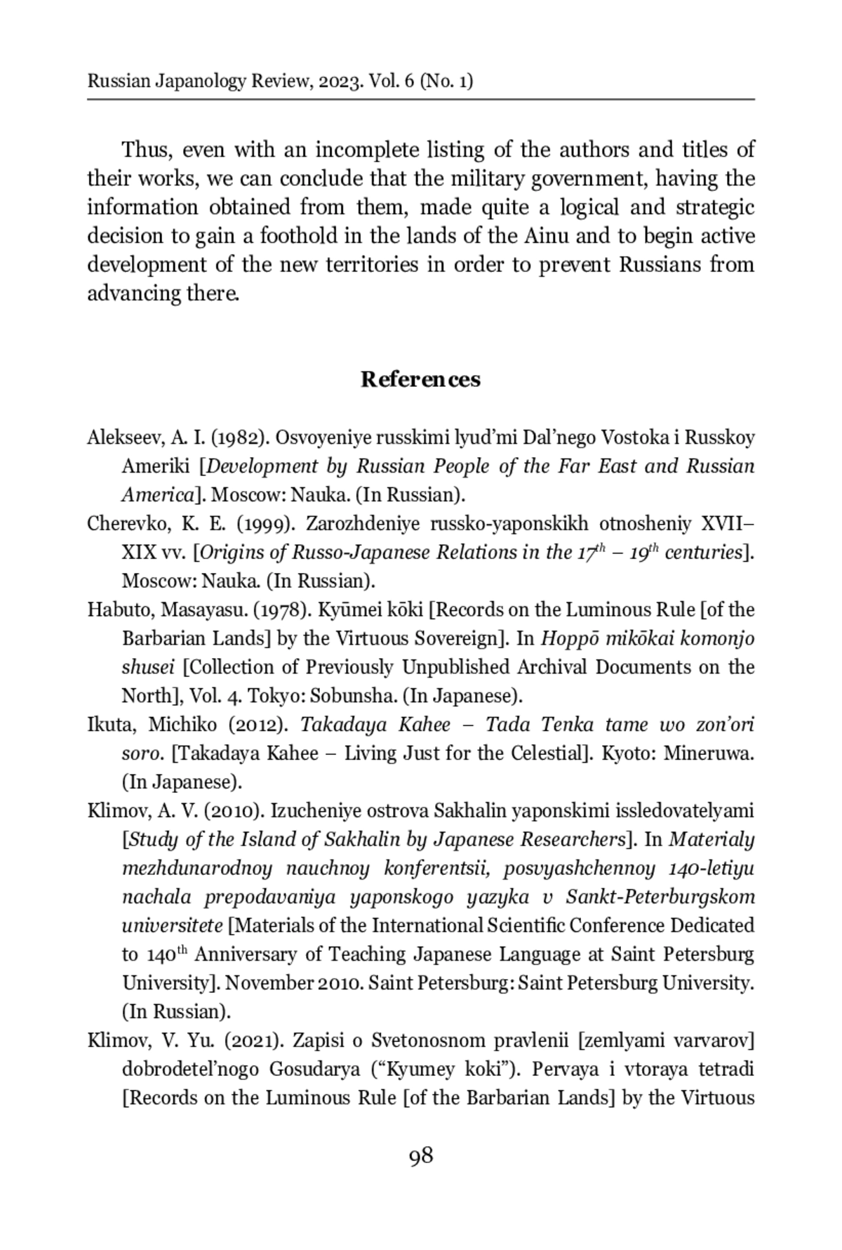 5. Klimov, A. V. (2010). Izucheniye ostrova Sakhalin yaponskimi issledovatelyami. In Materialy mezhdunarodnoy nauchnoy konferentsii, posvyashchennoy 140-letiyu nachala prepodavaniya yaponskogo yazyka v Sankt-Peterburgskom universitete. November 2010. Saint Petersburg: Saint Petersburg University. (In Russian).