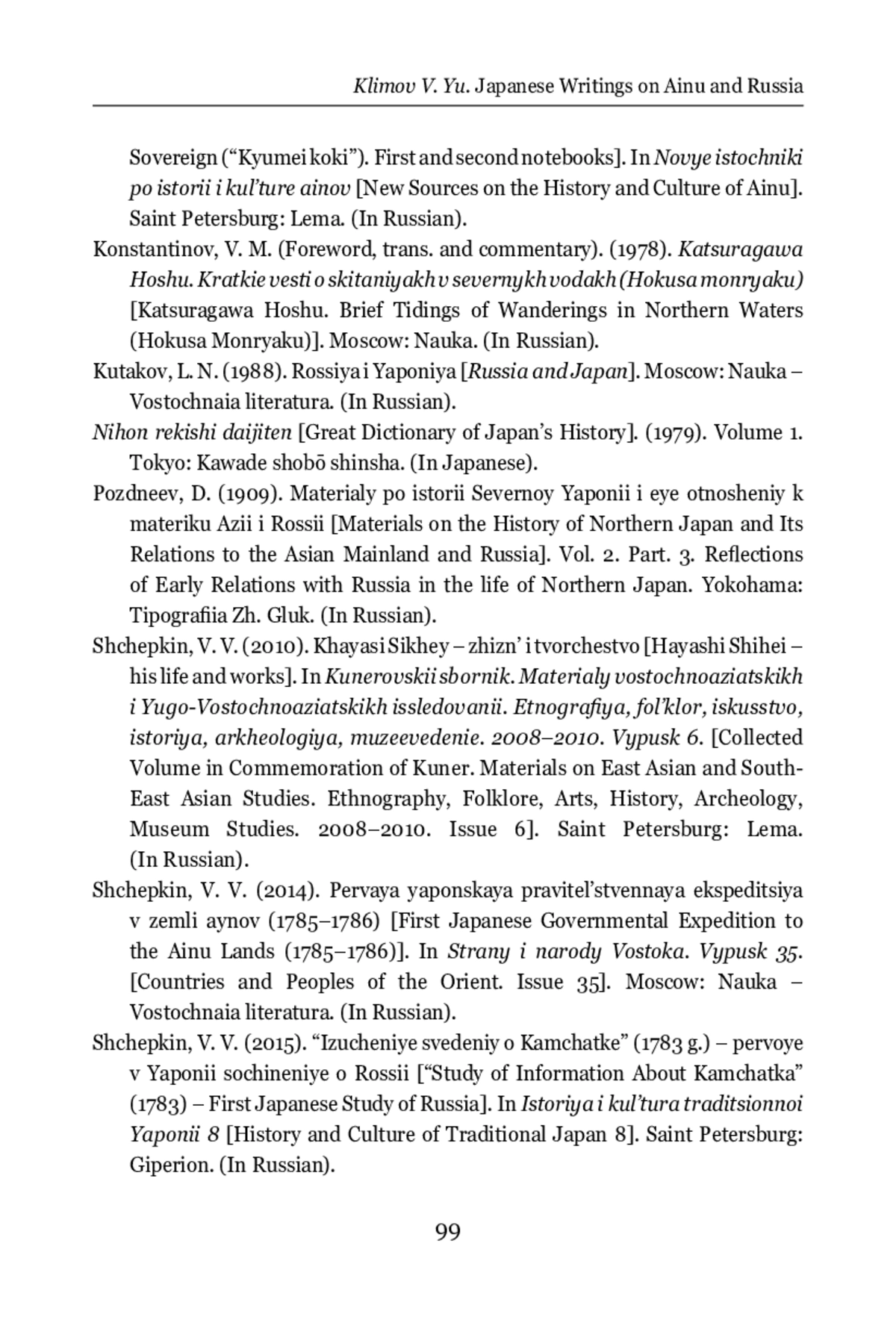 12. Shchepkin, V. V. (2014). Pervaya yaponskaya pravitel’stvennaya ekspeditsiya v zemli aynov (1785-1786). In Strany i narody Vostoka. Vypusk 35.. Moscow: Nauka - Vostochnaia literatura. (In Russian).
