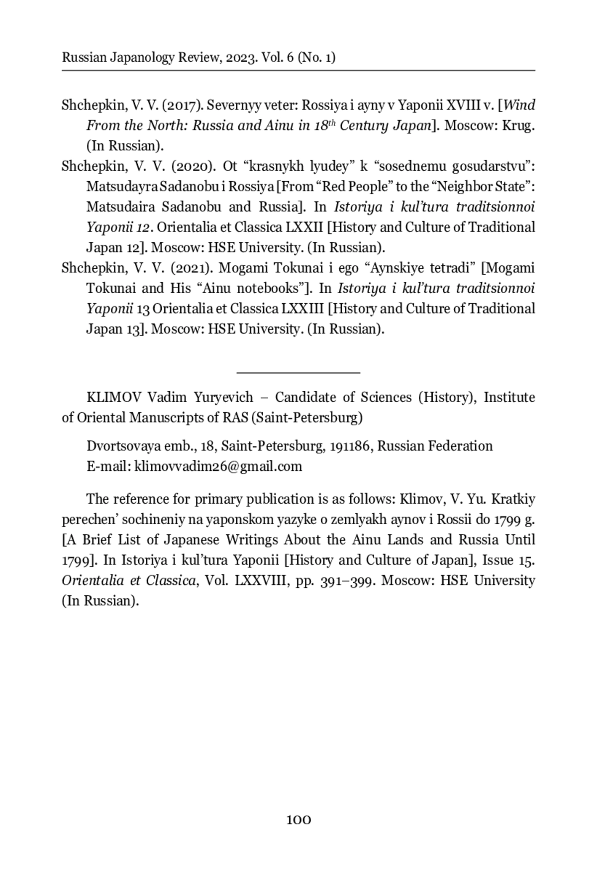 16. Shchepkin, V. V. (2021). Mogami Tokunai i ego “Aynskiye tetradi”. In Istoriya i kul’tura traditsionnoi Yaponii 13 Orientalia et Classica LXXIII. Moscow: HSE University. (In Russian).